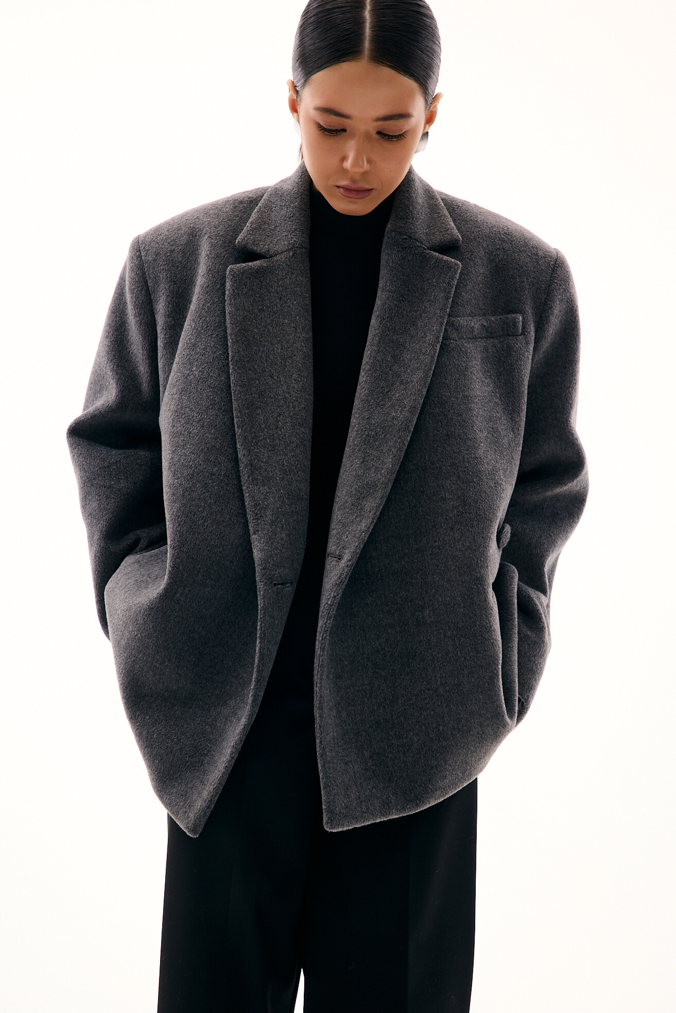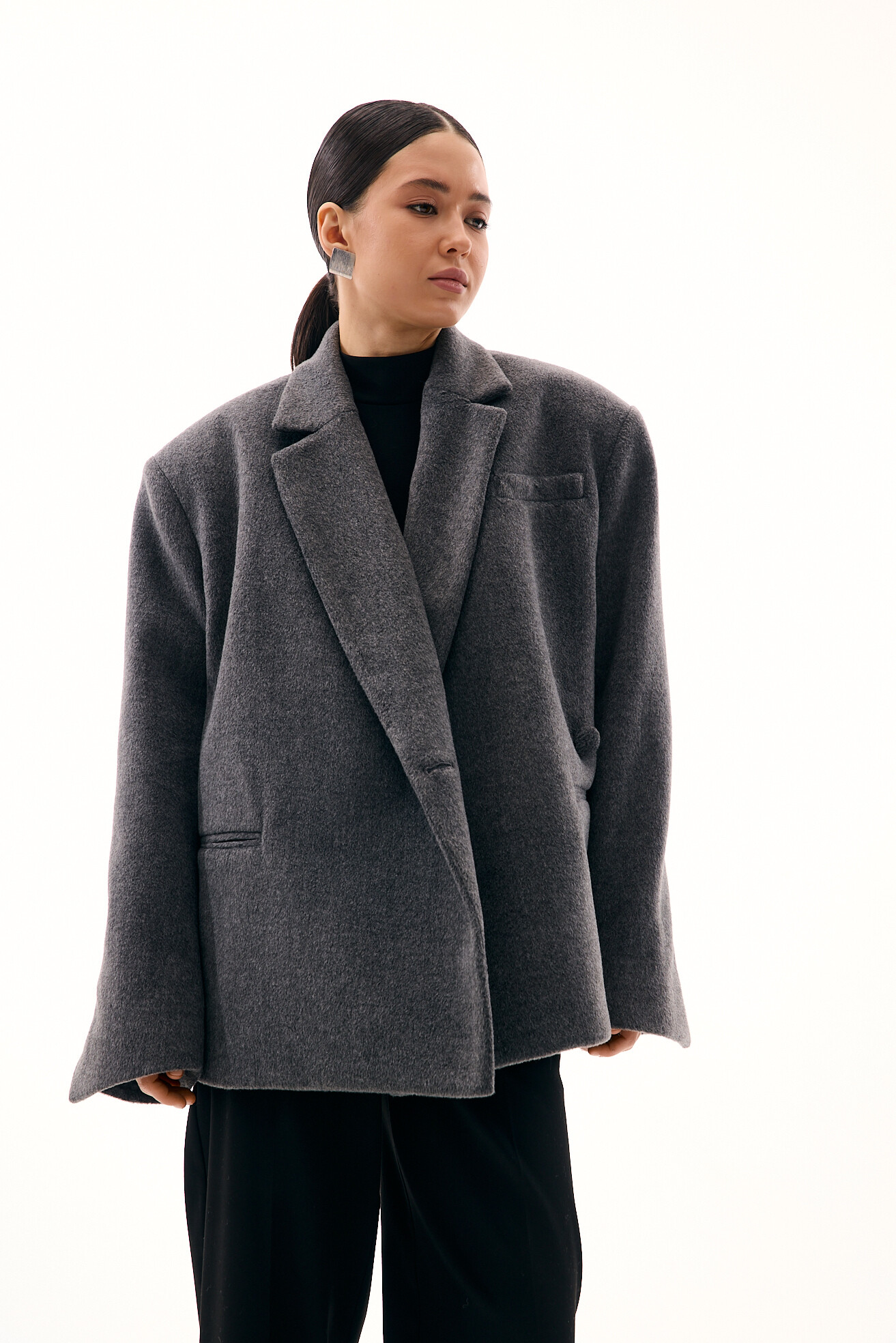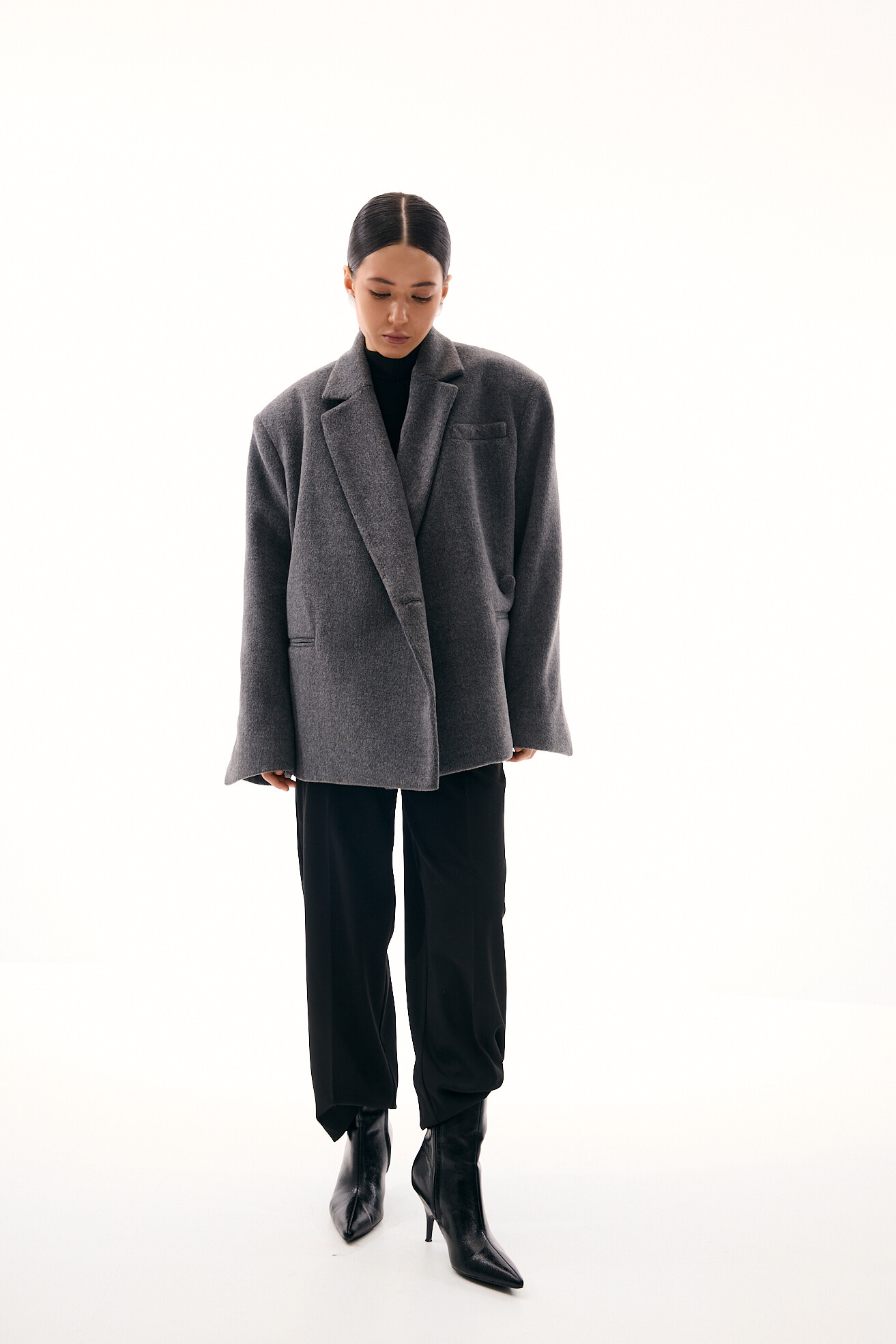 Зручний варіант верхнього одягу на весну - вкорочене пальто, яке ми пропонуємо у новому актуальному  оверсайз фасоні.  З цікавих акцентів - фігурні вирізи  збоків, що робить модель більш складною. Актуальний графітовий колір  виглядатиме в цьому сезоні дуже цікаво та стильно.  Матеріал ми обрали  з вмістом віскози та поліестеру, що робить його приємним до тіла та гарантує довгу зносостійкість, адже тканина не буде кошлатитися.