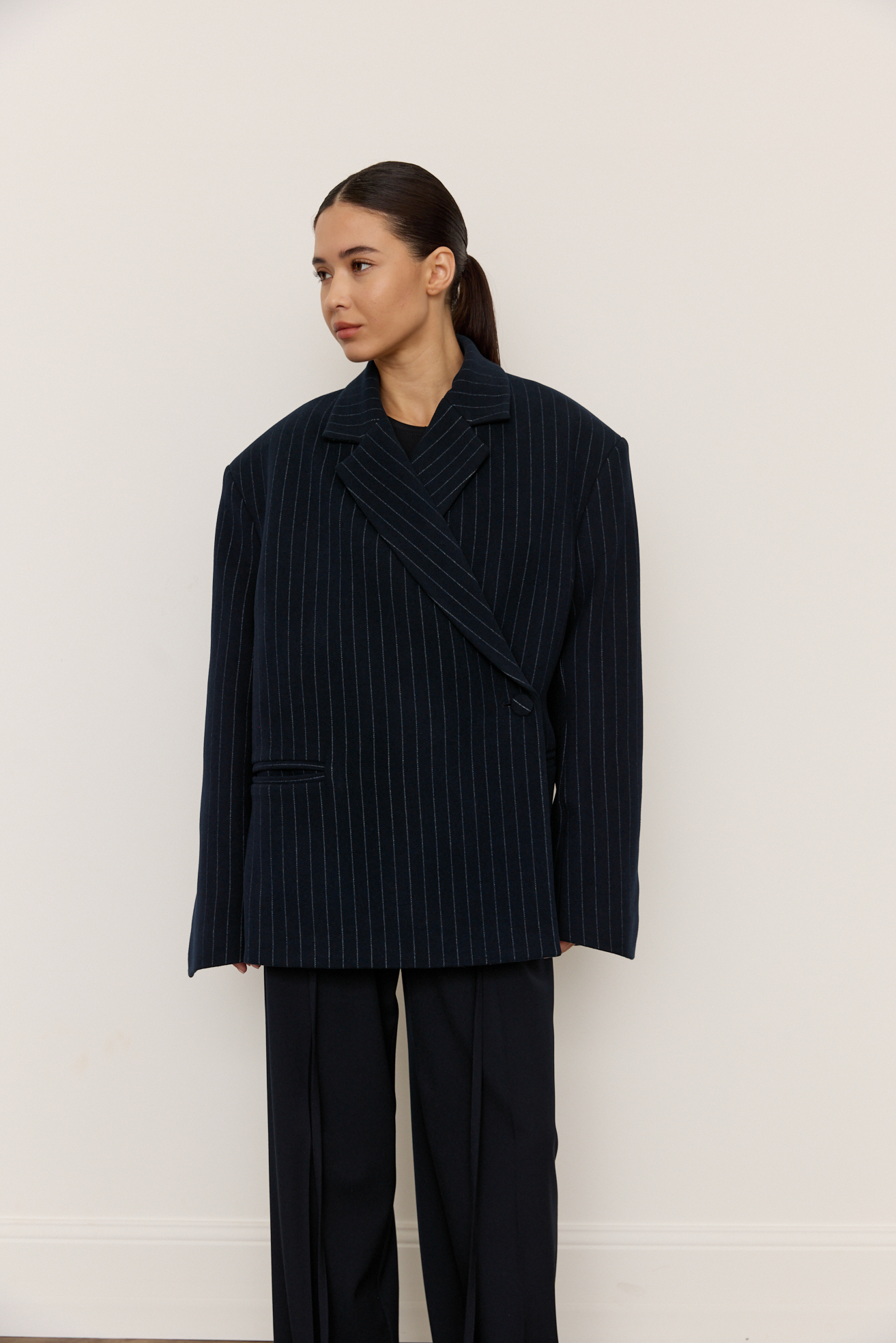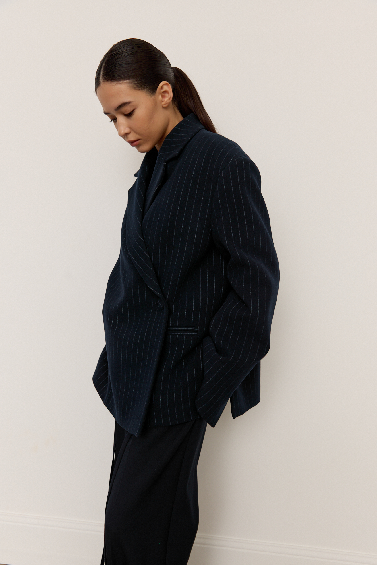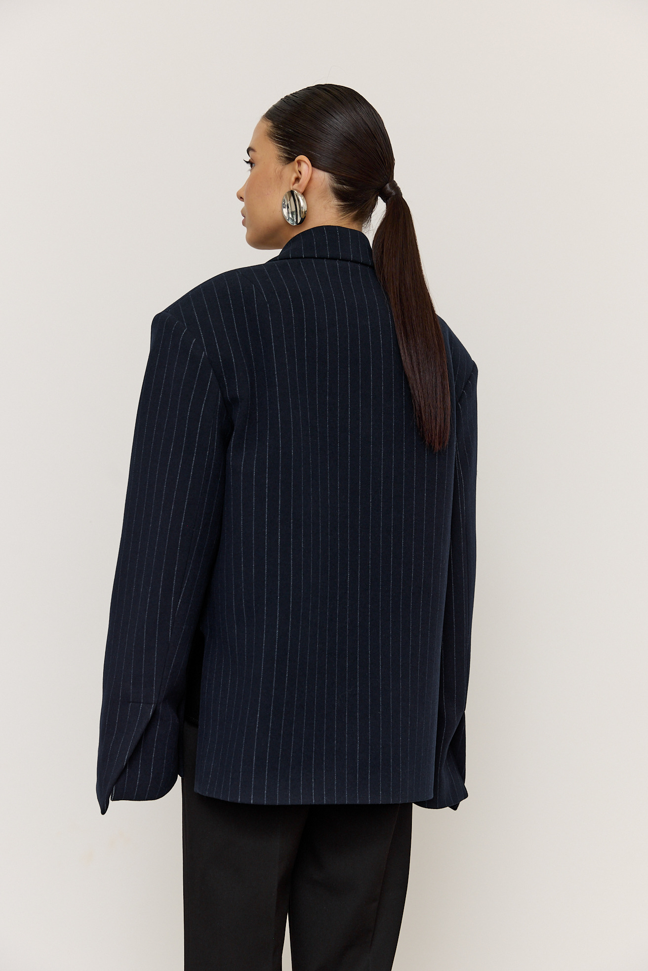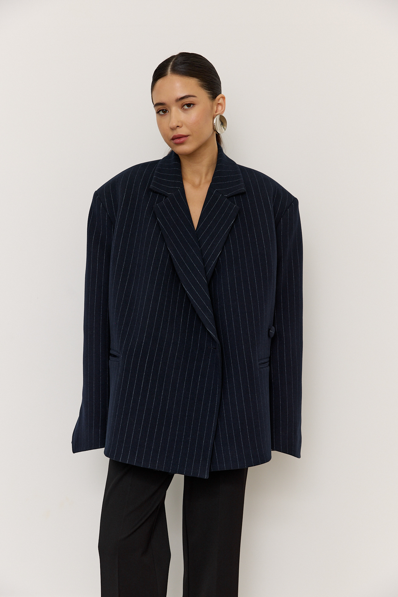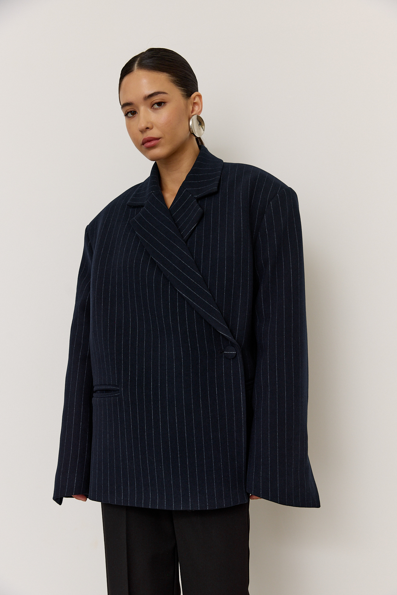Зручний варіант верхнього одягу на весну - вкорочене пальто, яке ми пропонуємо у новому актуальному  оверсайз фасоні.  З цікавих акцентів - фігурні вирізи  збоків, що робить модель більш складною. Актуальний темно-синій колір і помірна неакцентна смужка виглядатимуть в цьому сезоні дуже цікаво та стильно.  Матеріал ми обрали  з вмістом віскози та поліестеру, що робить його приємним до тіла та гарантує довгу зносостійкість, адже тканина не буде кошлатитися.
