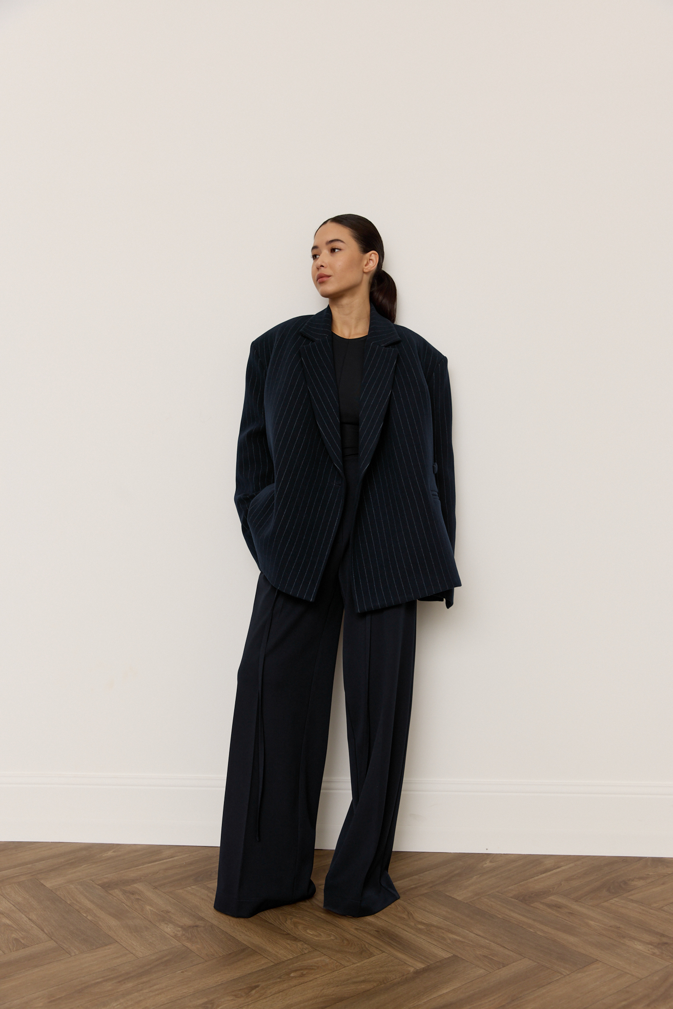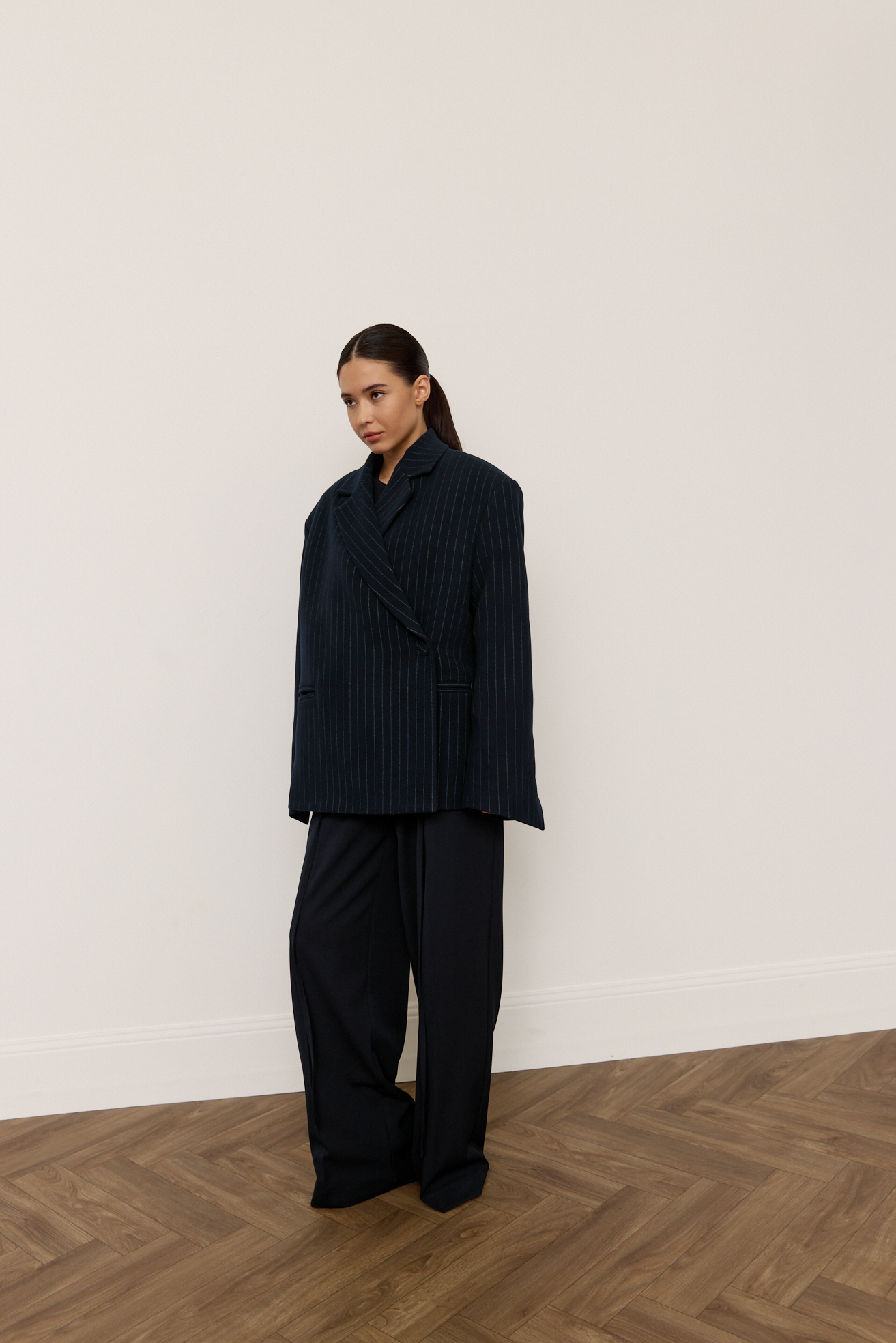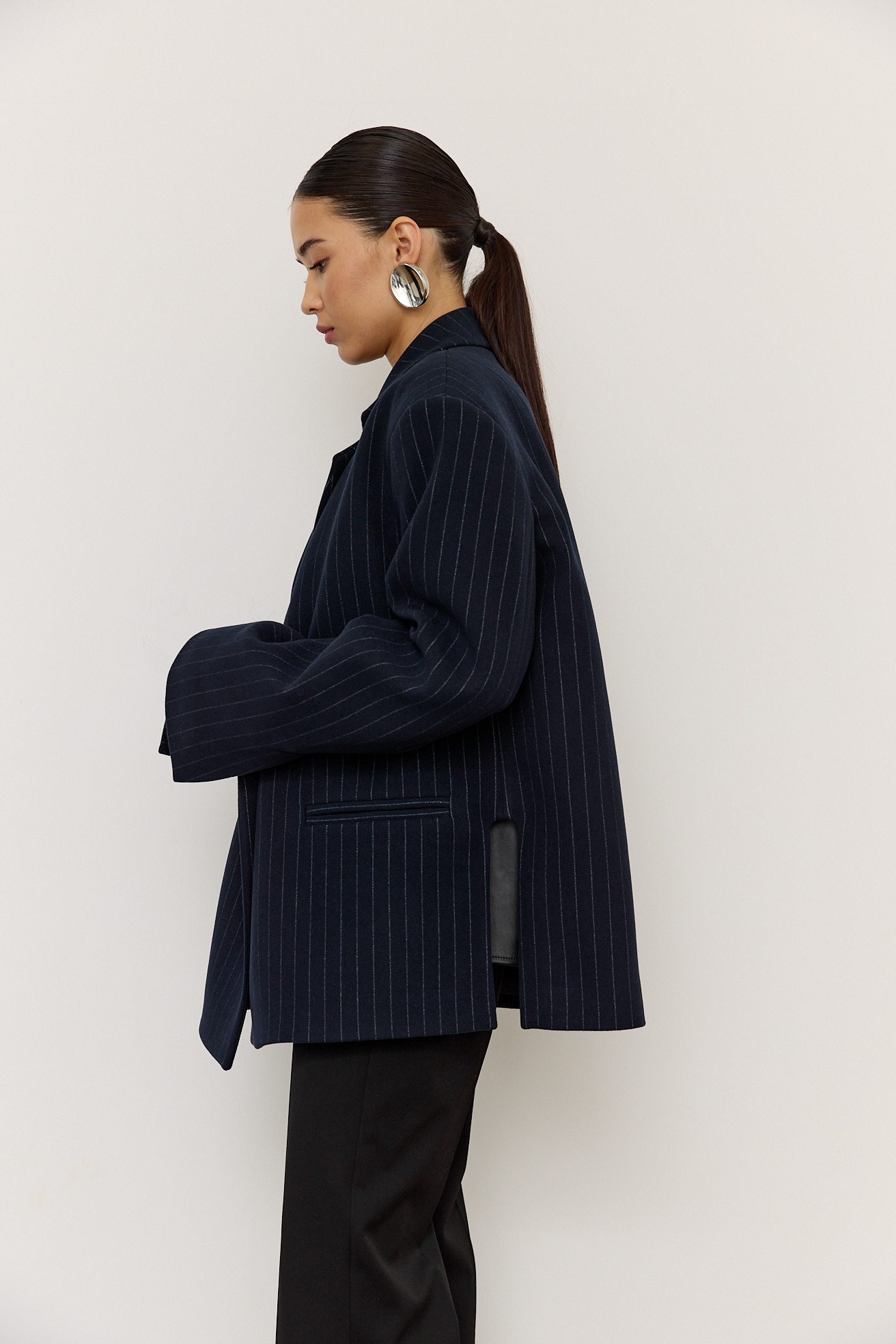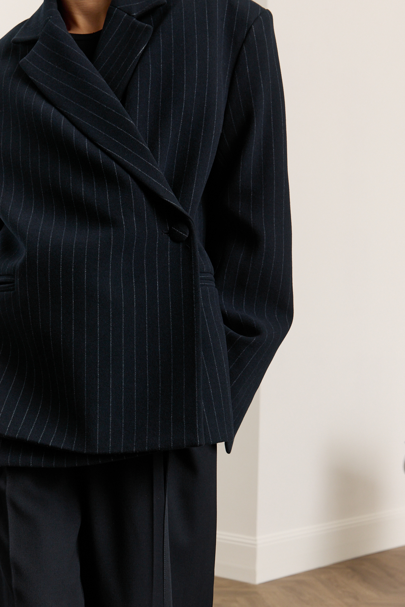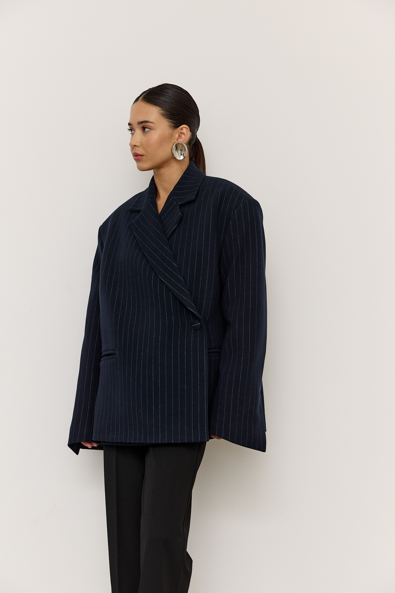 Зручний варіант верхнього одягу на весну - вкорочене пальто, яке ми пропонуємо у новому актуальному  оверсайз фасоні.  З цікавих акцентів - фігурні вирізи  збоків, що робить модель більш складною. Актуальний темно-синій колір і помірна неакцентна смужка виглядатимуть в цьому сезоні дуже цікаво та стильно.  Матеріал ми обрали  з вмістом віскози та поліестеру, що робить його приємним до тіла та гарантує довгу зносостійкість, адже тканина не буде кошлатитися.