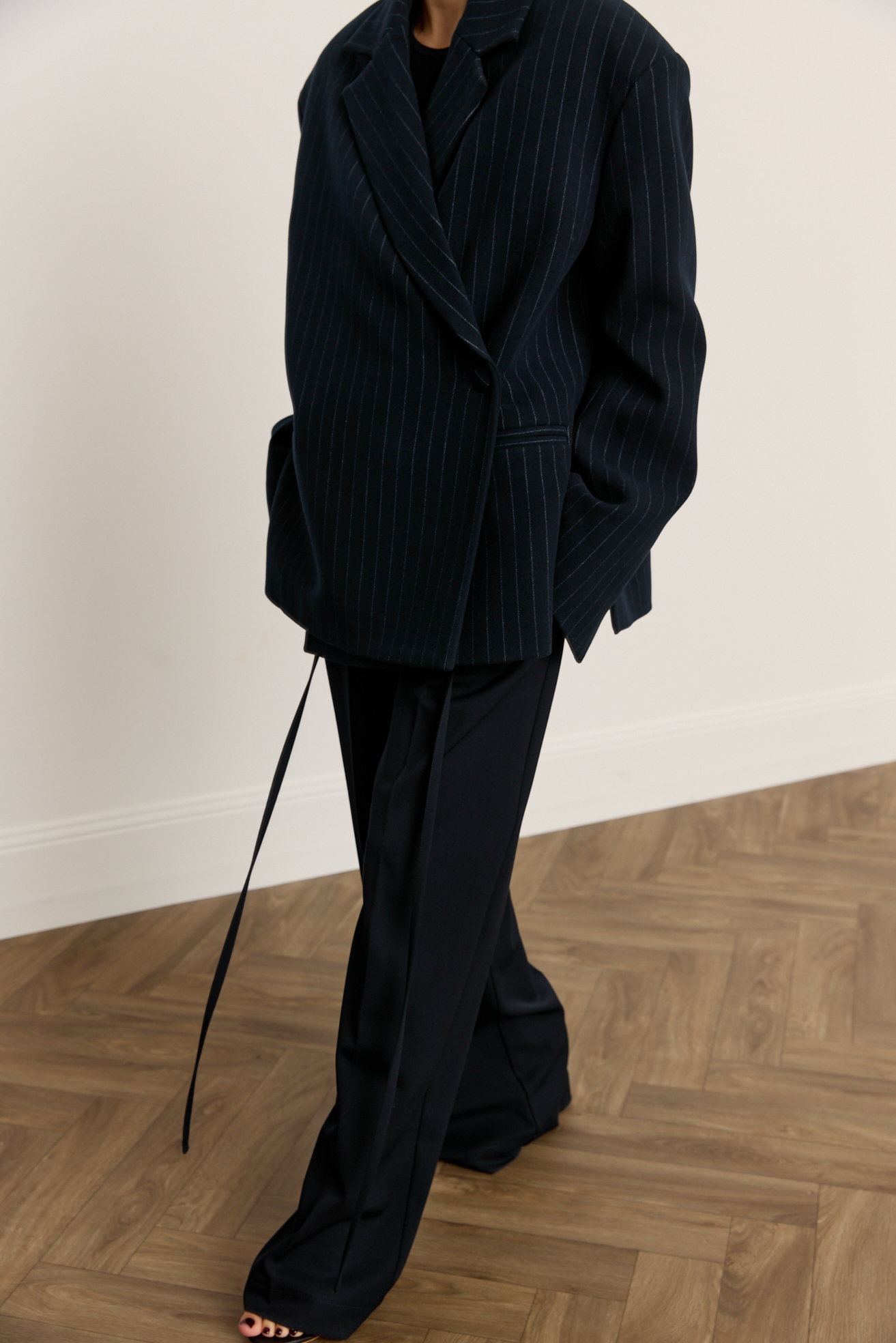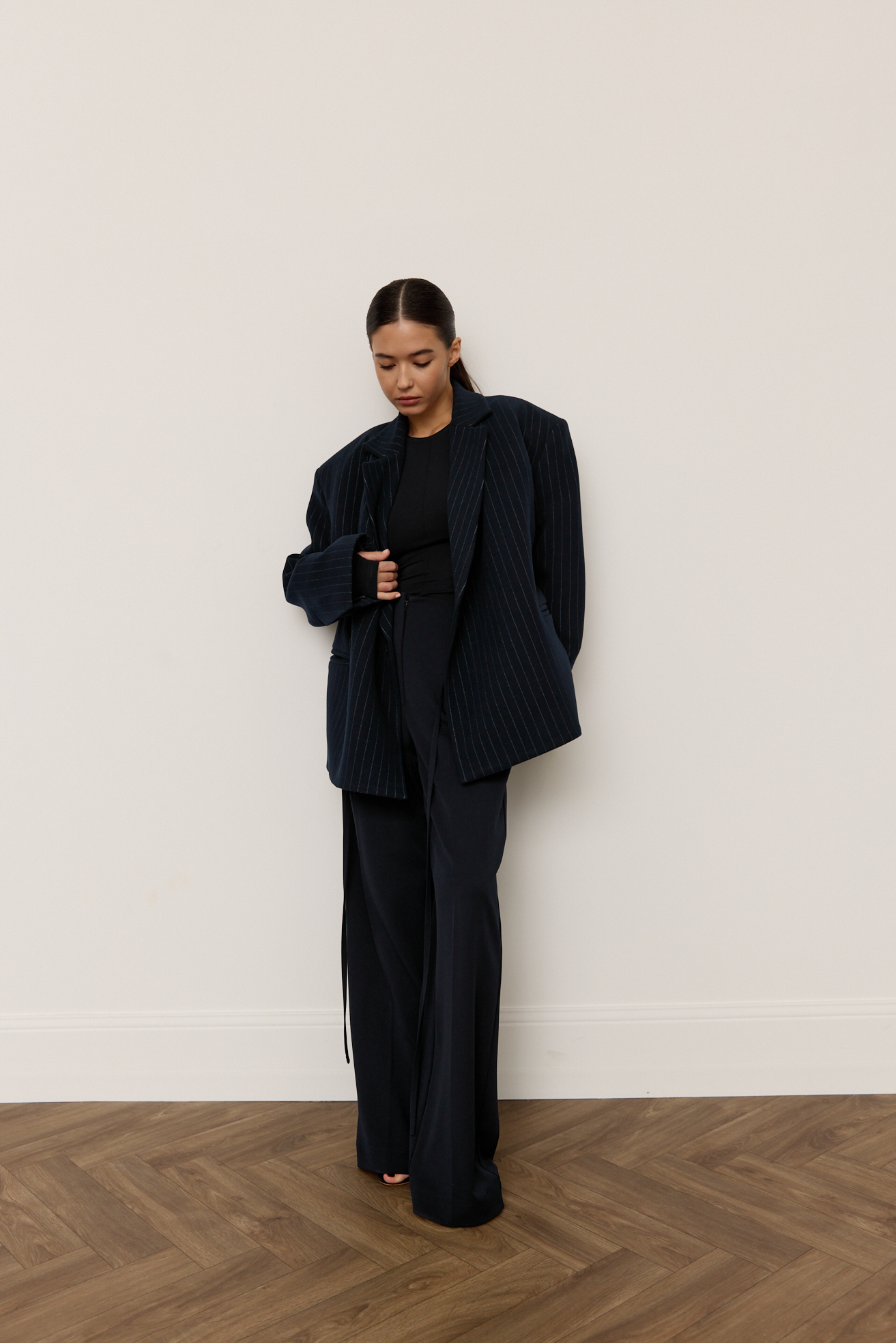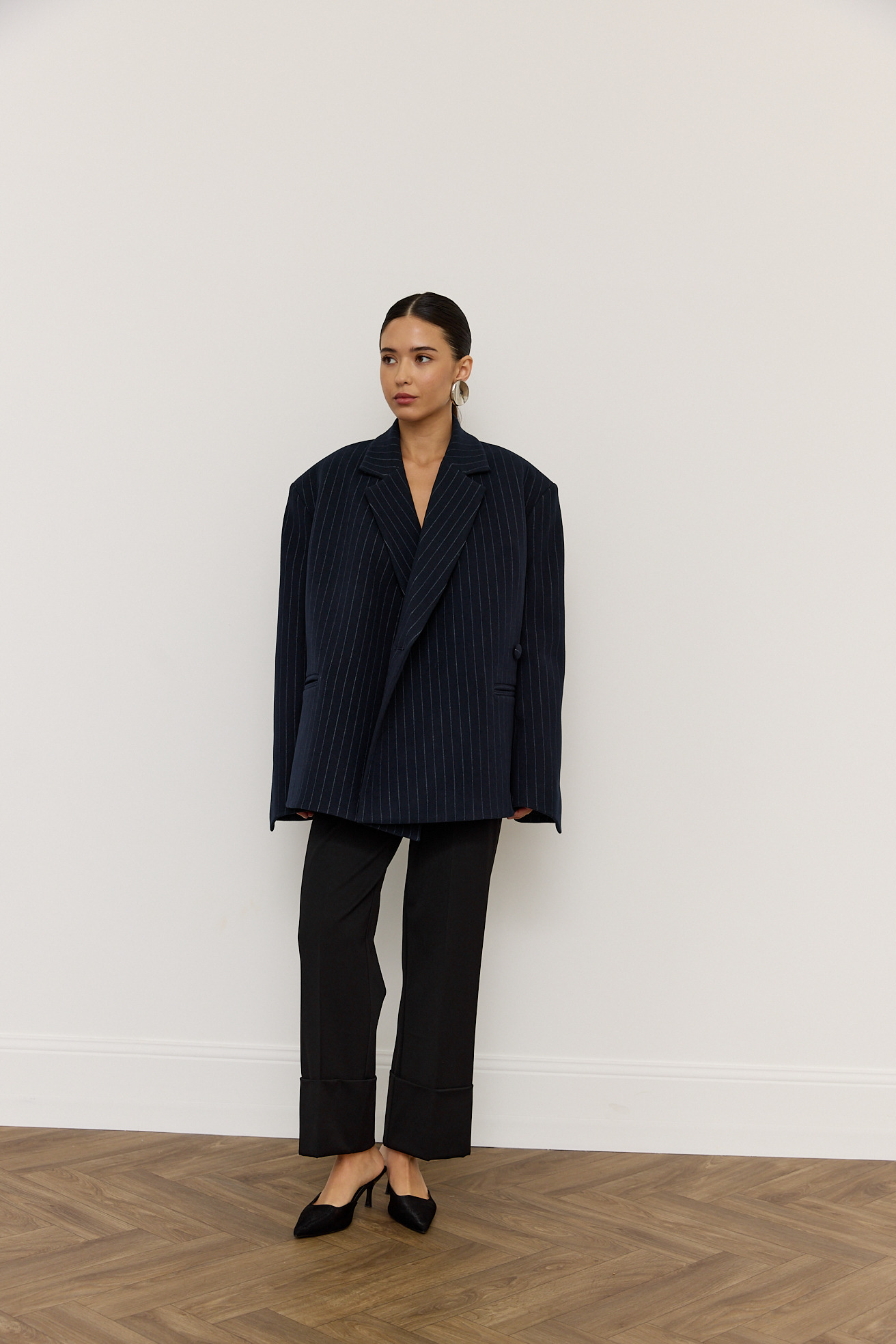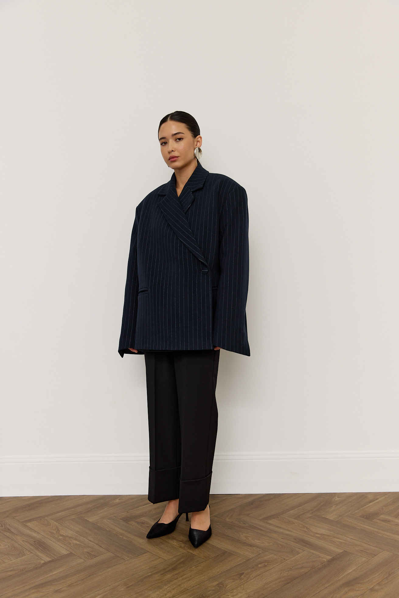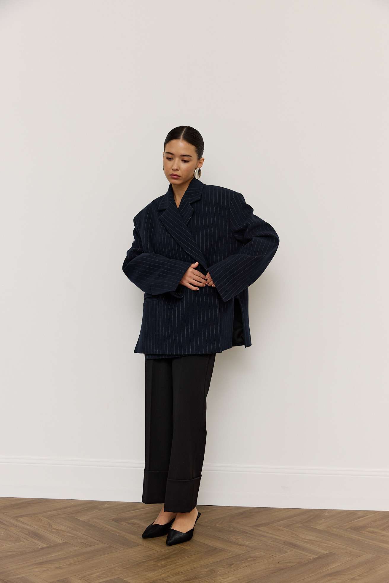 Зручний варіант верхнього одягу на весну - вкорочене пальто, яке ми пропонуємо у новому актуальному  оверсайз фасоні.  З цікавих акцентів - фігурні вирізи  збоків, що робить модель більш складною. Актуальний темно-синій колір і помірна неакцентна смужка виглядатимуть в цьому сезоні дуже цікаво та стильно.  Матеріал ми обрали  з вмістом віскози та поліестеру, що робить його приємним до тіла та гарантує довгу зносостійкість, адже тканина не буде кошлатитися.