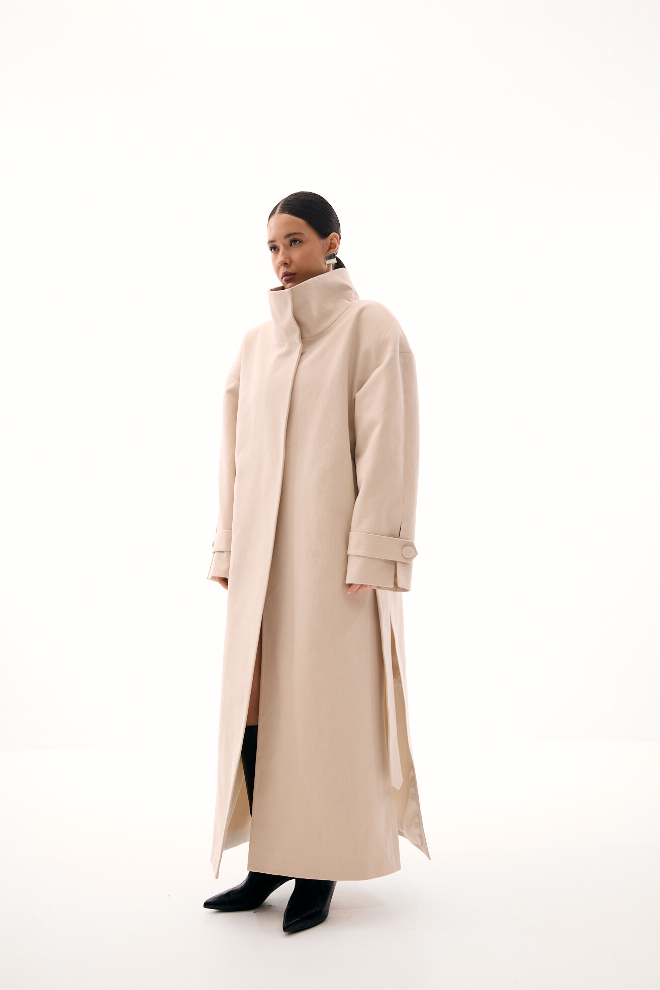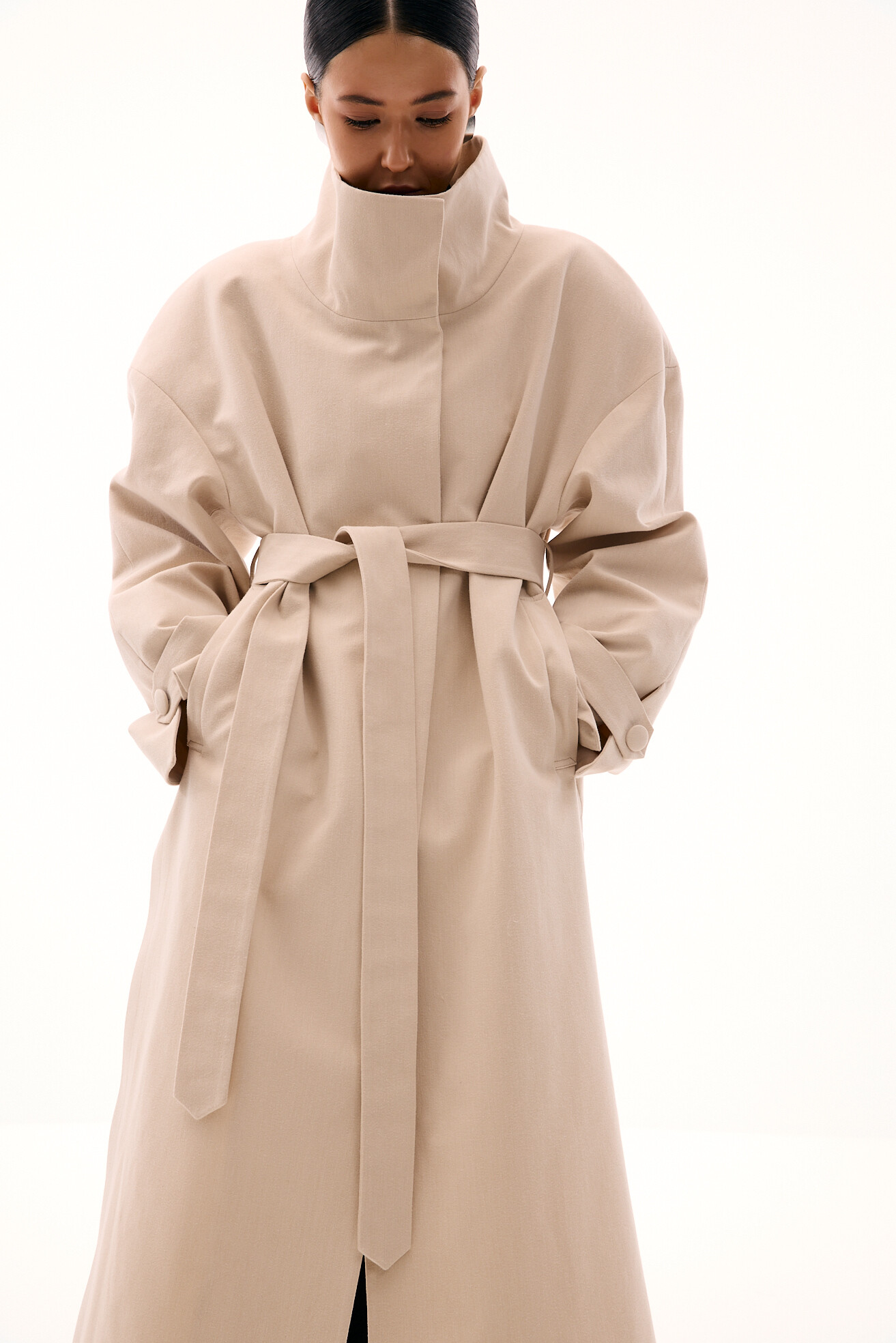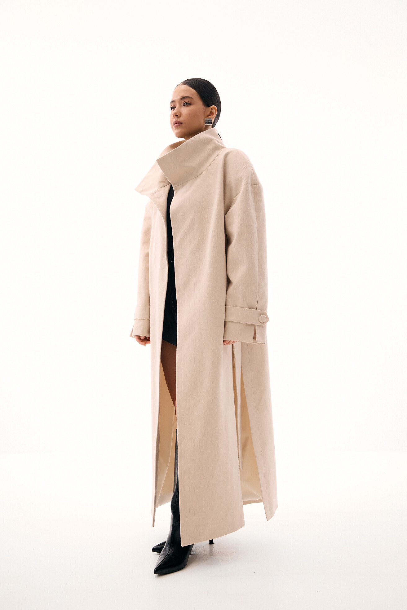 Модель тренчу, яка яскраво виділяється в нашій колекції - це оверсайз-фасон у мінімалістичному виконанні без зайвих деталей. Об’ємне лекало, актуальна висока горловина-стійка та бокові розрізи додають силуету розслабленості й сучасності. Приємний бежевий відтінок легко поєднується з весняним гардеробом. Тренч виконаний із щільного котону, який добре тримає форму. Універсальна, зручна та носибельна модель на кожен день.