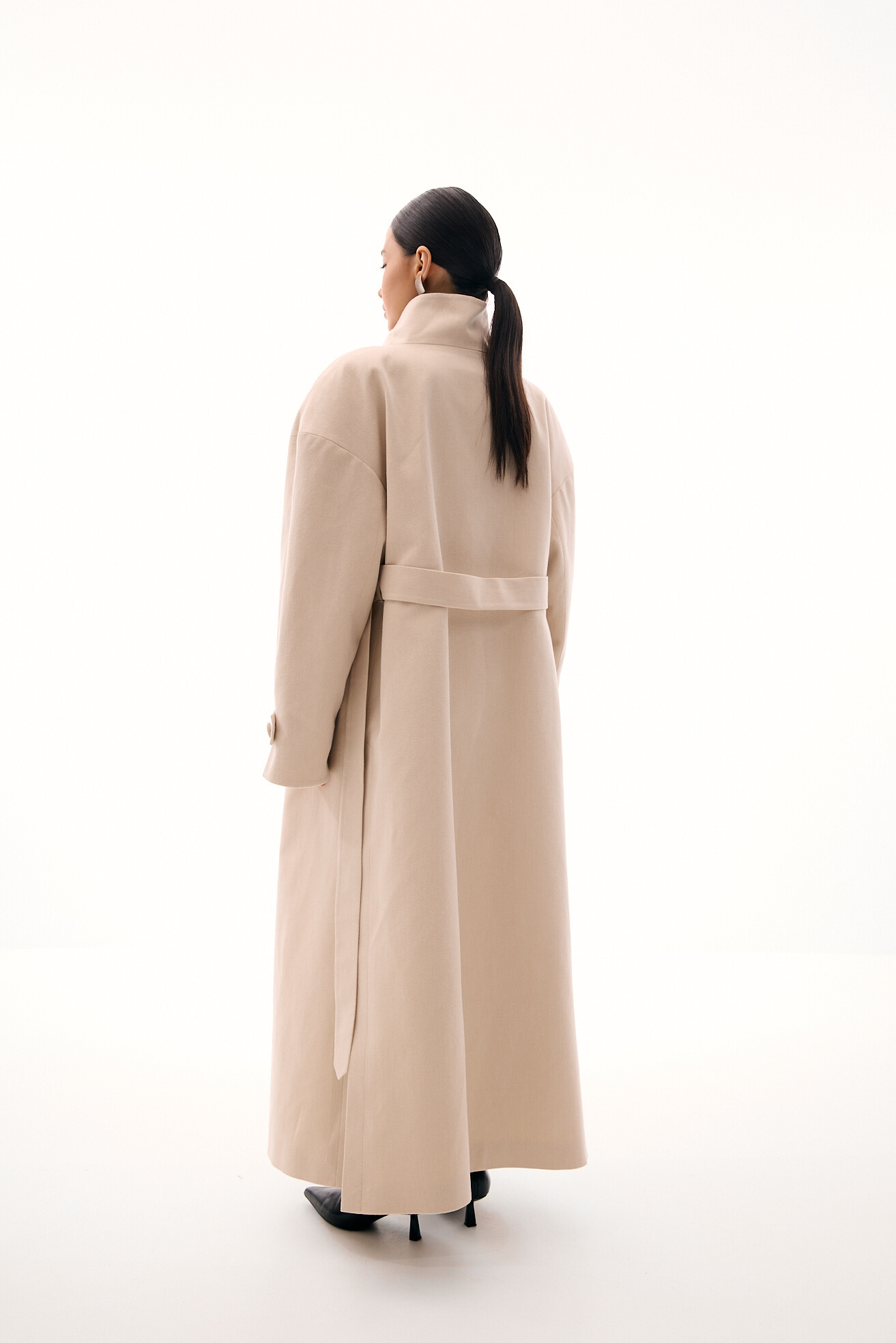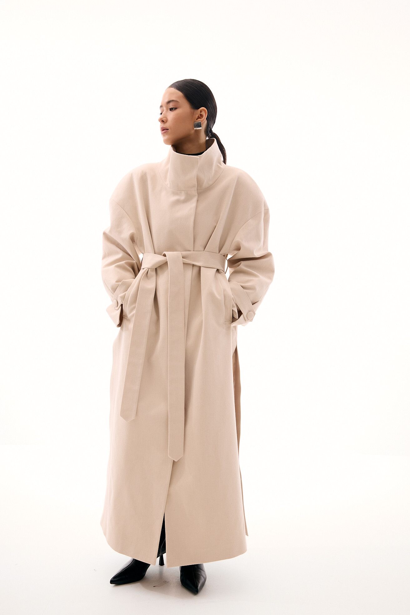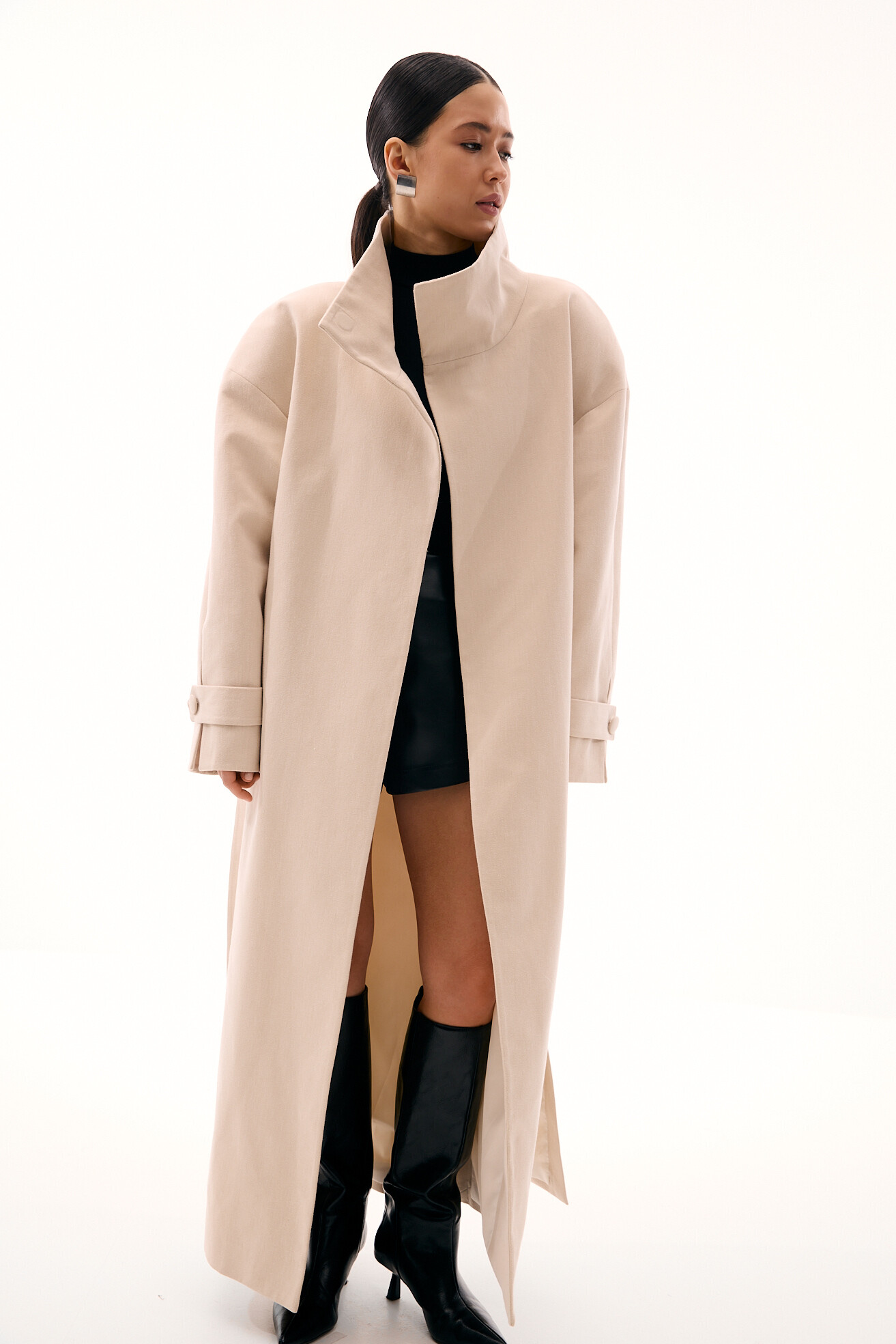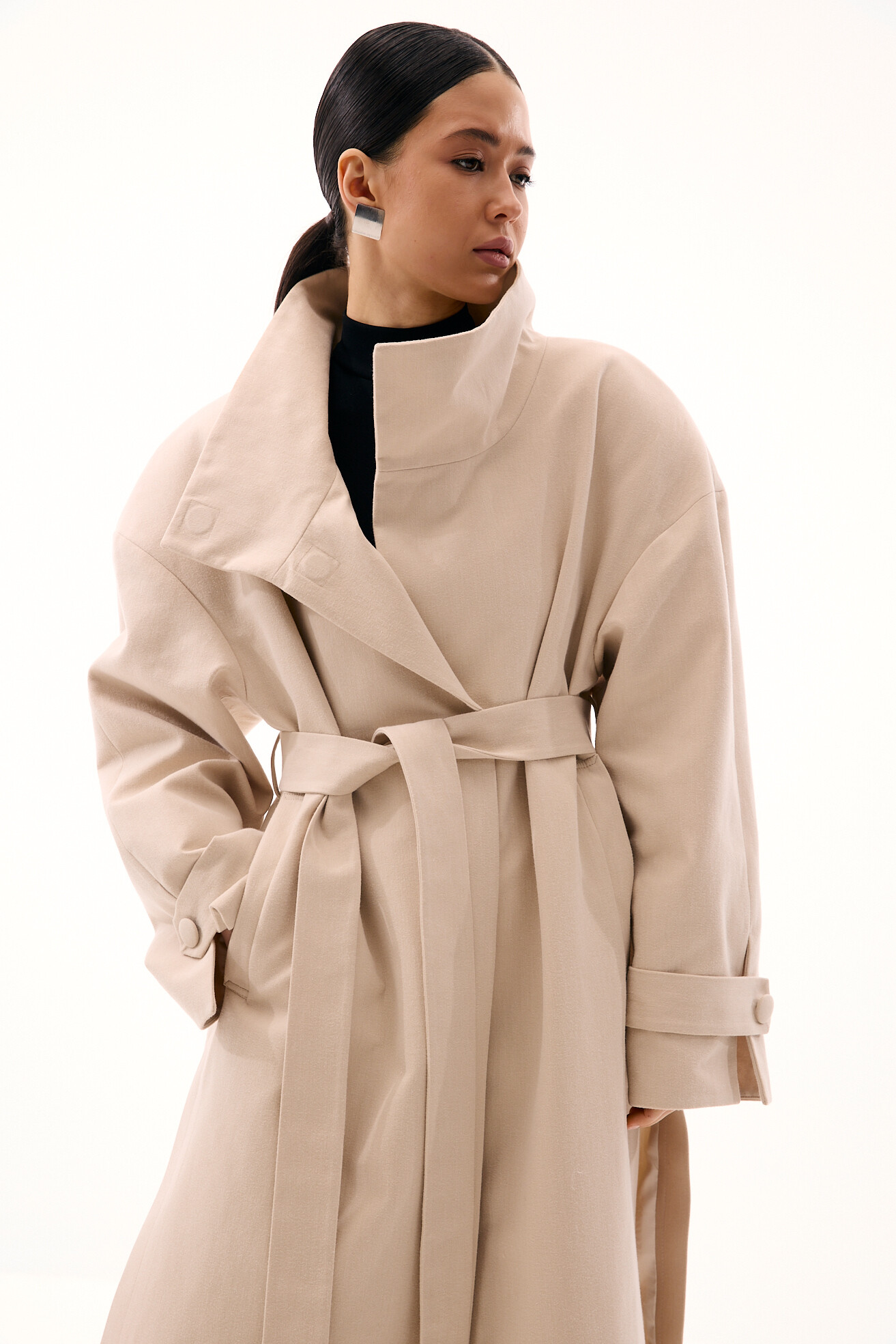 Модель тренчу, яка яскраво виділяється в нашій колекції - це оверсайз-фасон у мінімалістичному виконанні без зайвих деталей. Об’ємне лекало, актуальна висока горловина-стійка та бокові розрізи додають силуету розслабленості й сучасності. Приємний бежевий відтінок легко поєднується з весняним гардеробом. Тренч виконаний із щільного котону, який добре тримає форму. Універсальна, зручна та носибельна модель на кожен день.