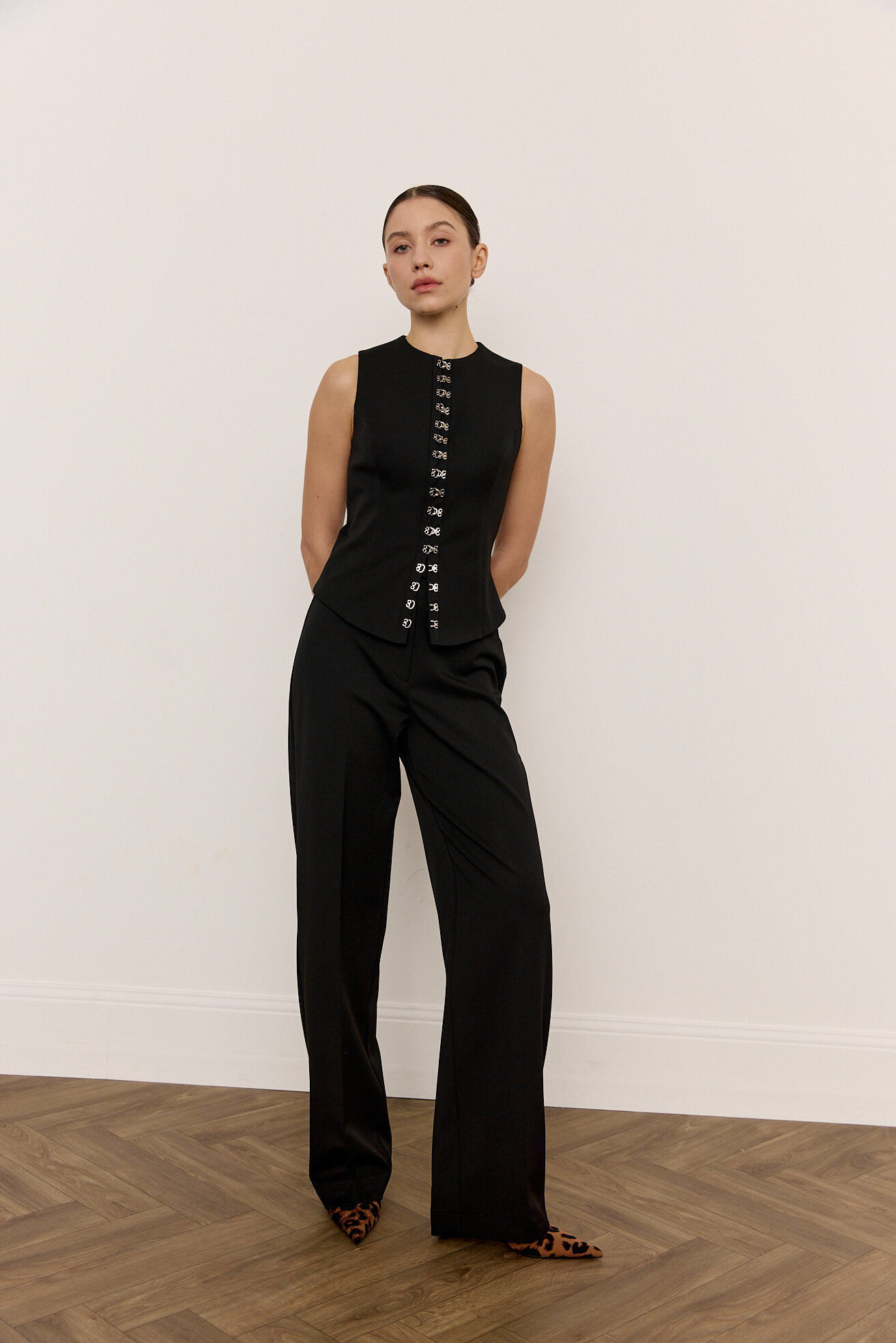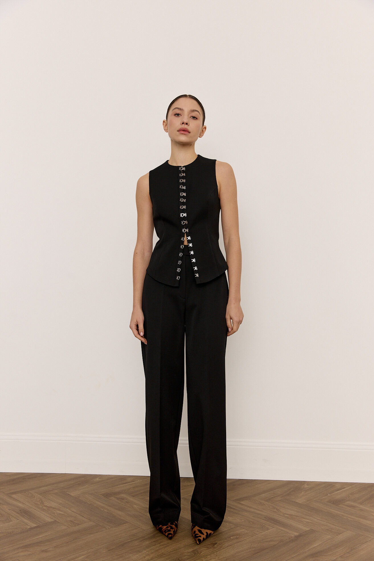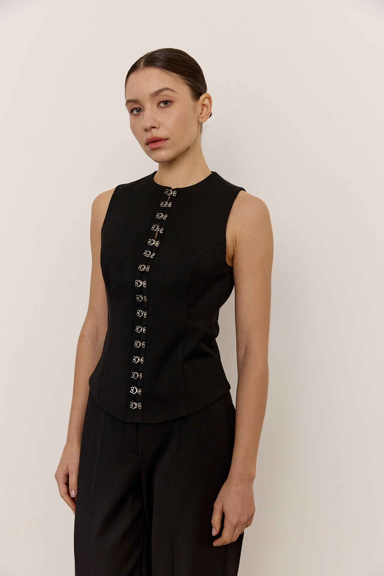 Акцентний жилет з металевими застібками стане цікавим акцентом будь-якого базового гардеробу.  Зручний універсальний крій робить його комфортним для щоденного носіння, а додаткова фурнітура додає цікавості та  складності виробу.  Жилет виконаний з додаванням бавовняної підкладки, що робить його приємним до тіла.