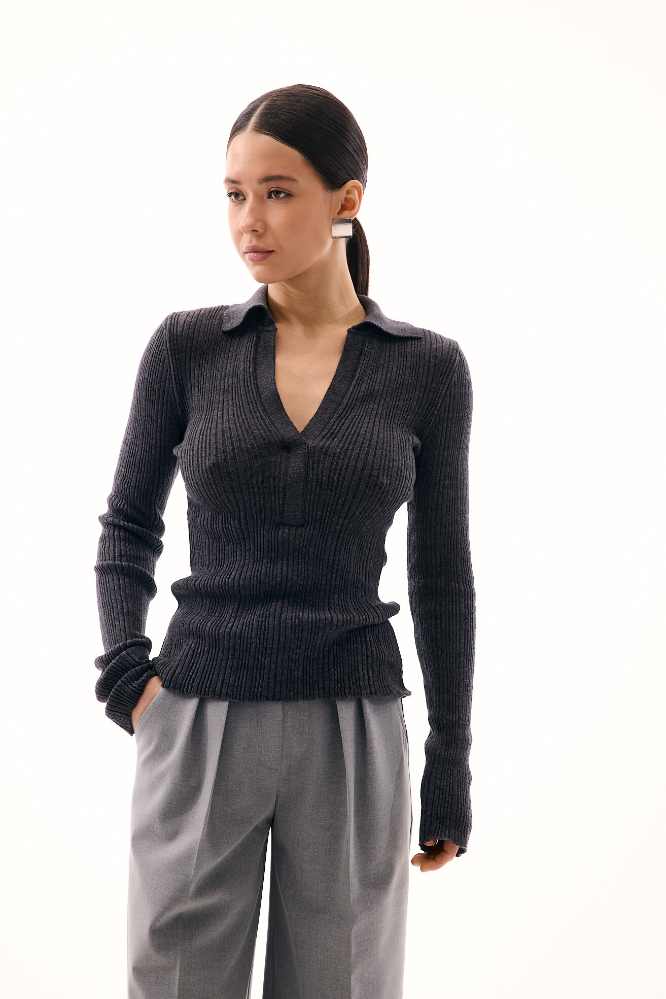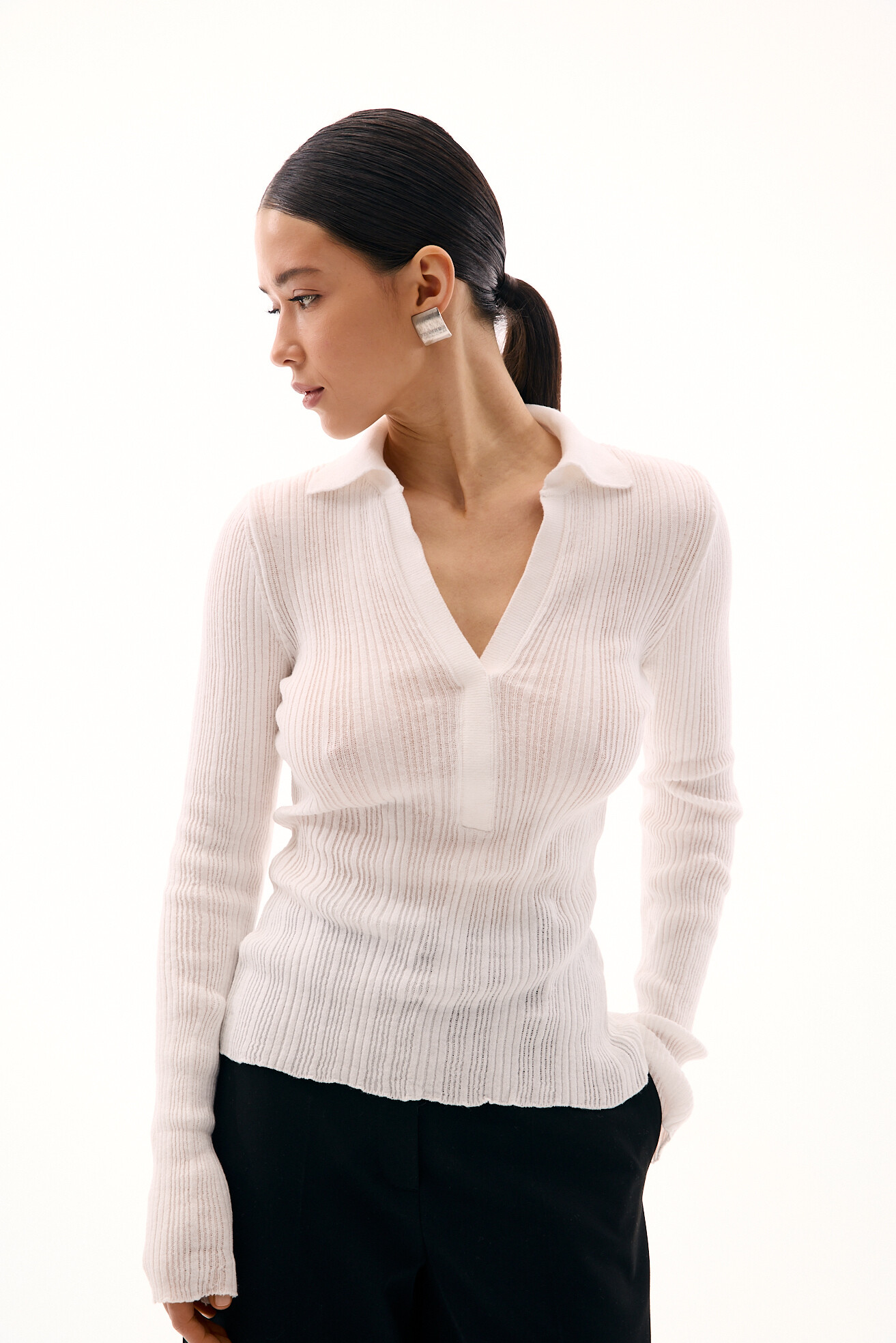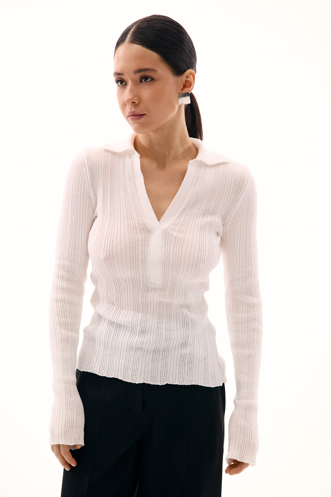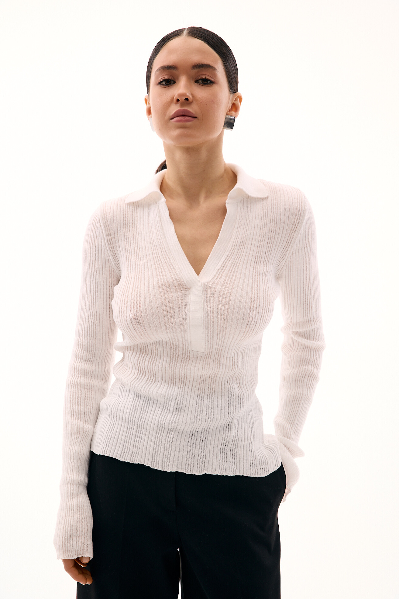 В’язаний лонгслів із легкої напівпрозорої віскозної в’язки — стильна база на щодень. Актуальний V-виріз у поєднанні з комірцем-поло додає образу сучасності та легкої елегантності. М’яка текстура приємна до тіла й забезпечує комфорт у носінні. Універсальна модель, яка легко впишеться в будь-який гардероб і створить свіжі, мінімалістичні образи.