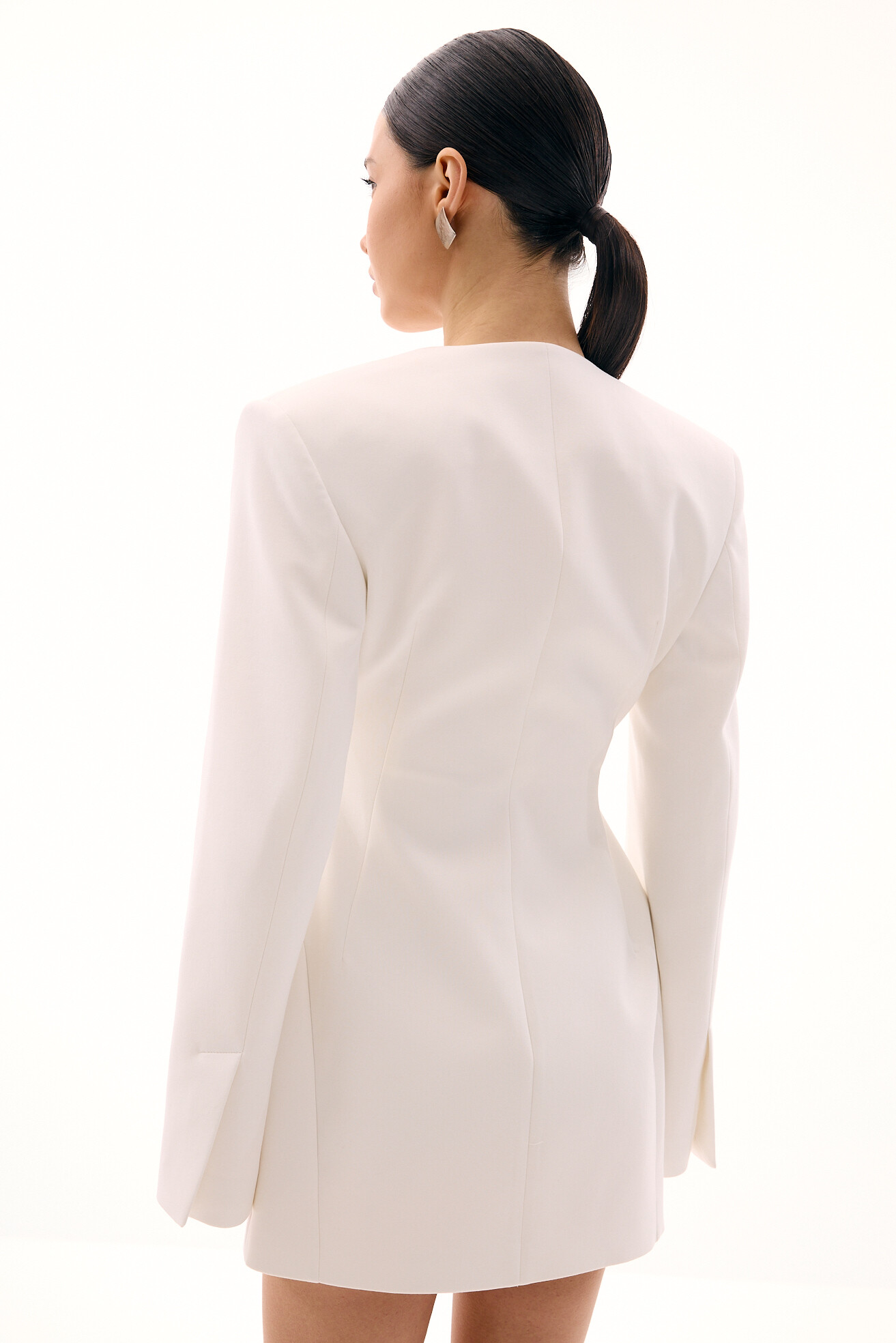 Сукня формує виразний силует пісочного годинника завдяки продуманому архітектурному крою. Актуальний V-виріз доповнений конструктивними елементами, які акцентують лінію плечей і стегон, візуально звужуючи талію. Широкі плечі та виразні бедра створюють сильний, сучасний образ. Модель виконана на підкладці, добре тримає форму та виглядає небанально й дорого. Застібається на приховані ґудзики, що підтримують лаконічний та акуратний вигляд сукні.