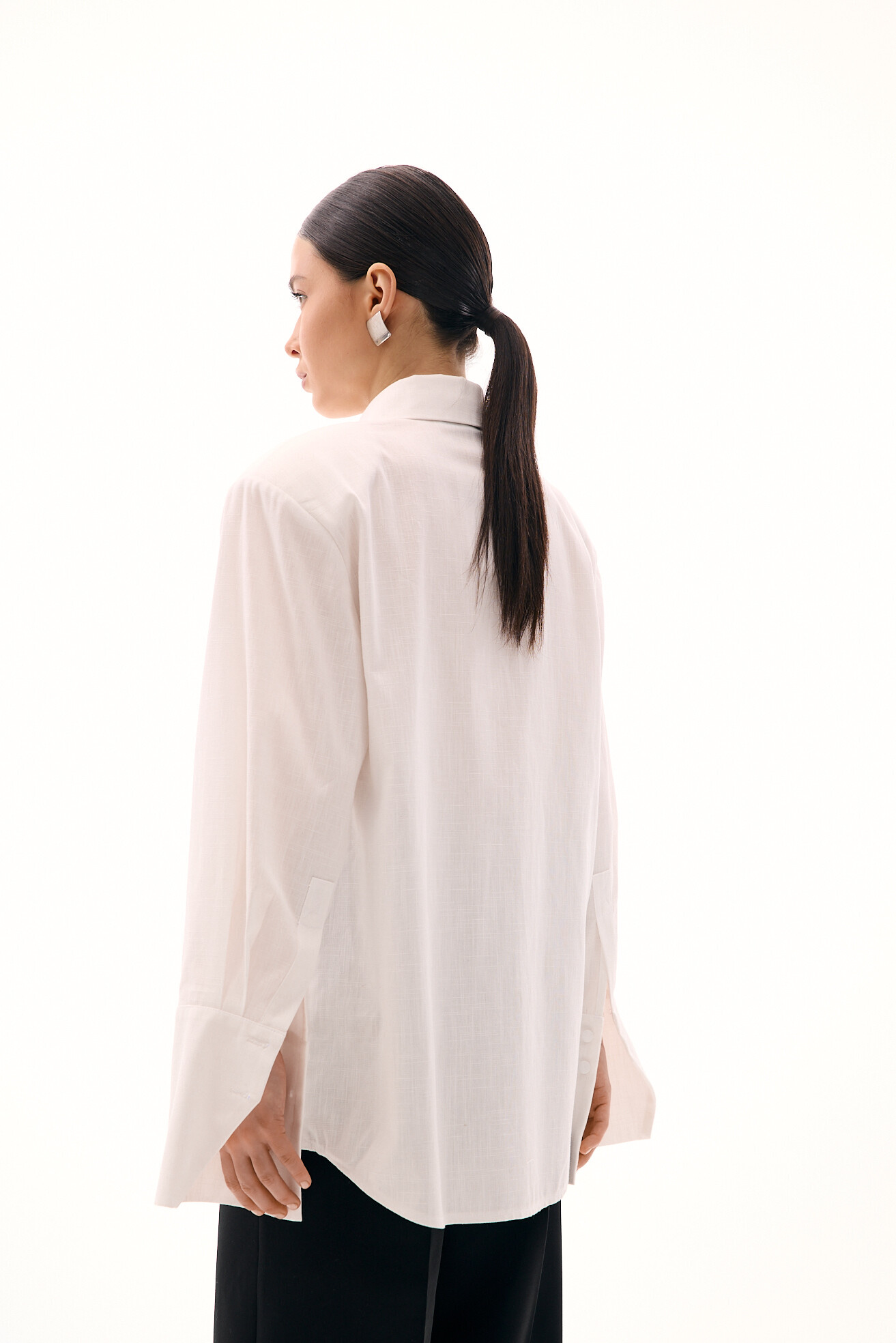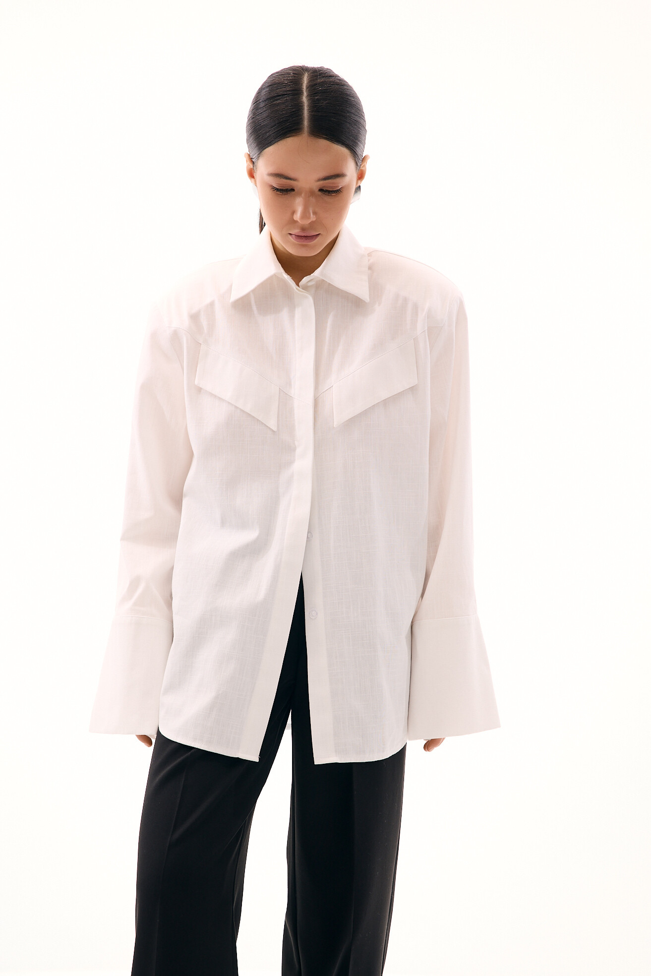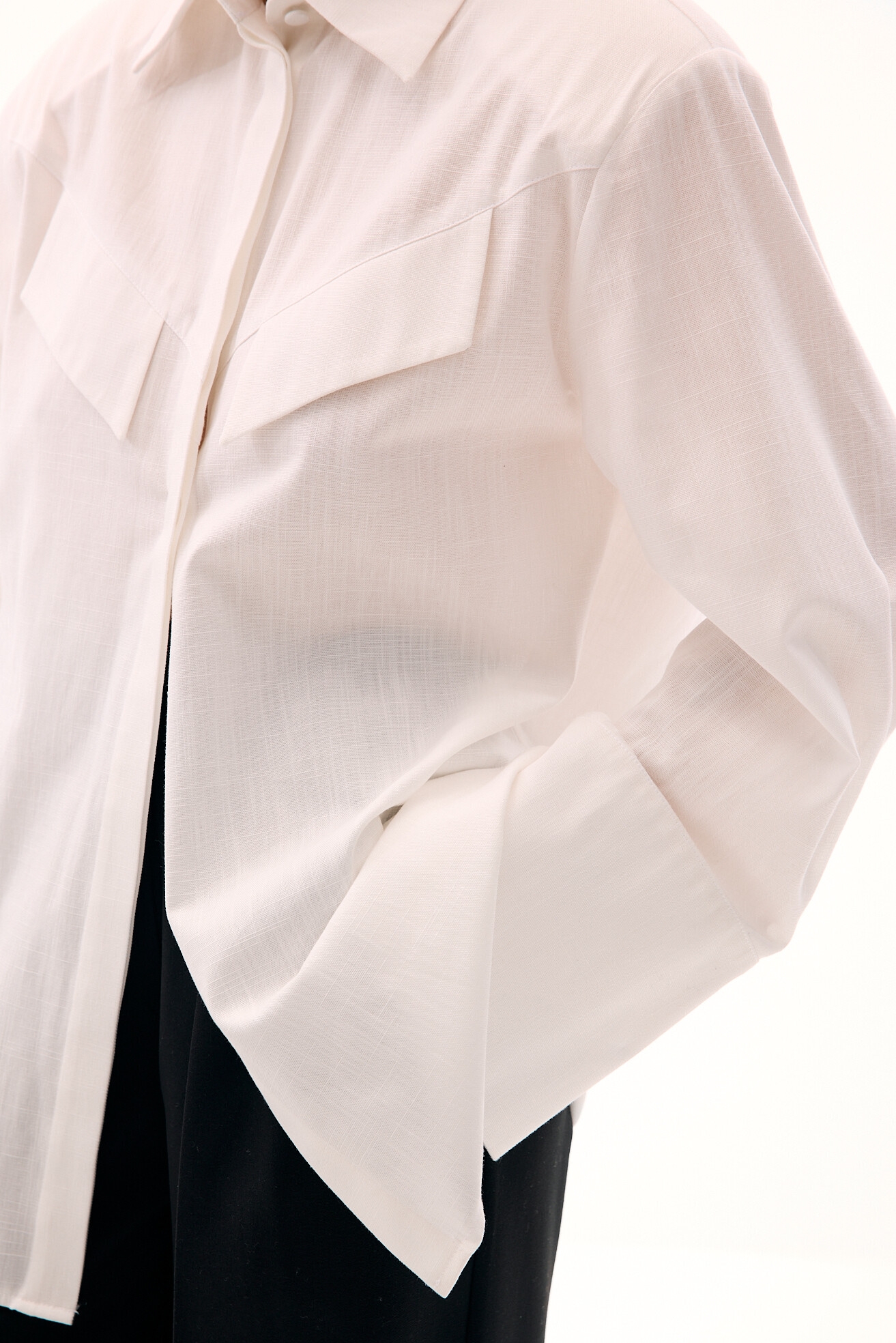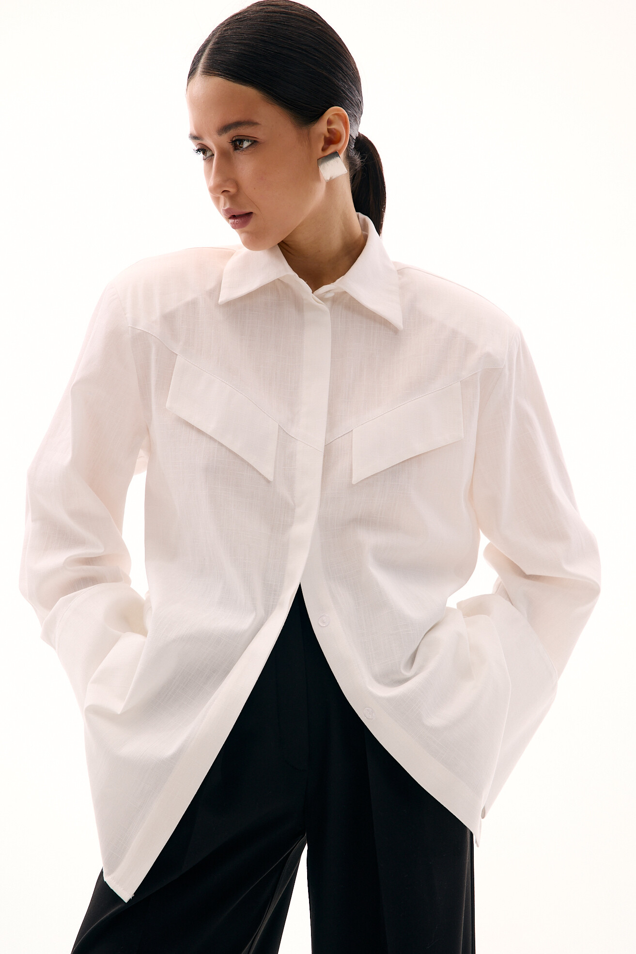 Акцентна сорочка з масивними підплічниками виглядає сучасно та виразно. Для її виконання ми обрали структуровану бавовну, яка додає формі чіткості та не виглядає банально. Цікавим акцентом виступає імітація клапанів від кишень, що підсилює характер моделі. Стильна, лаконічна та з характером — ця сорочка легко стане основою ефектних образів.