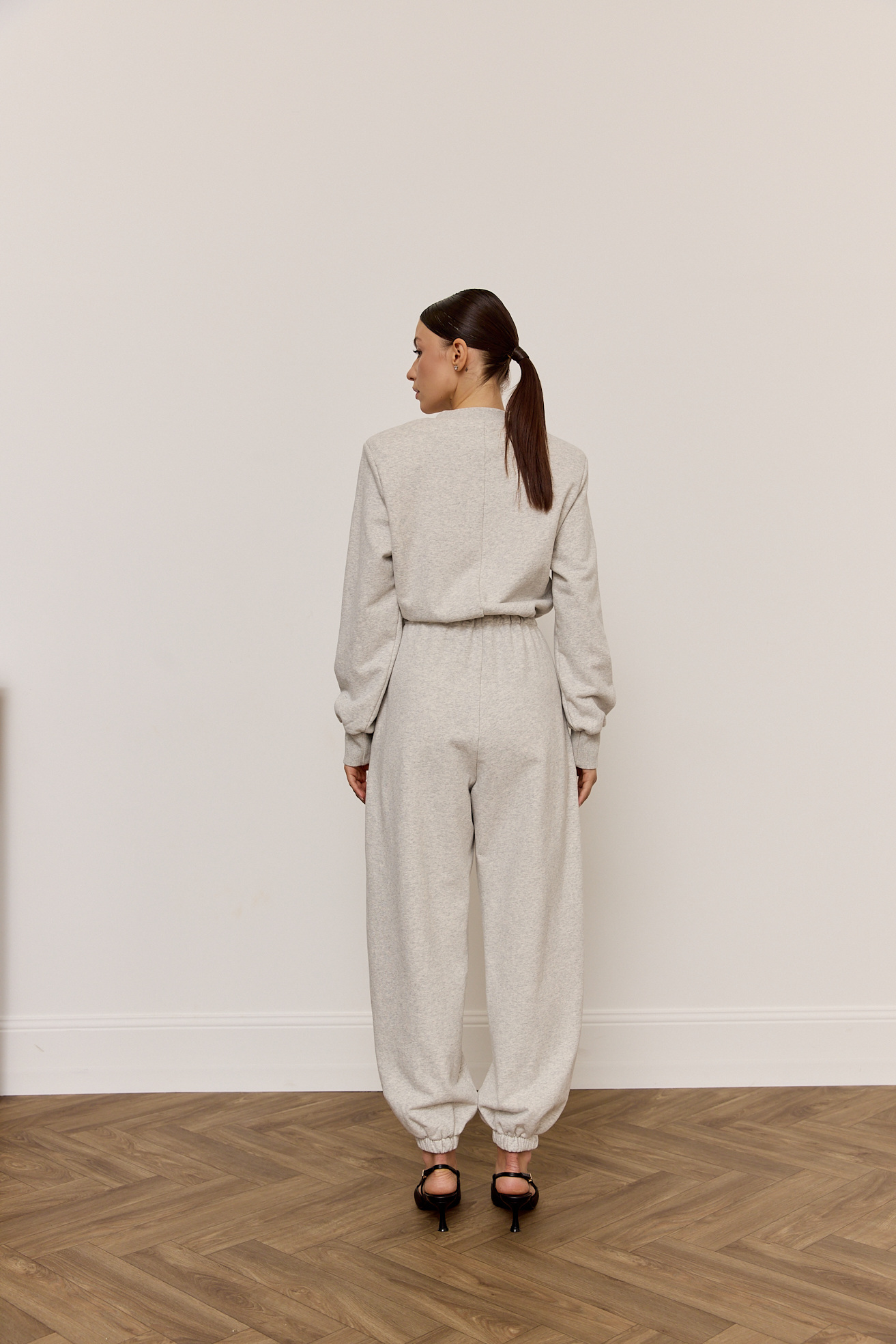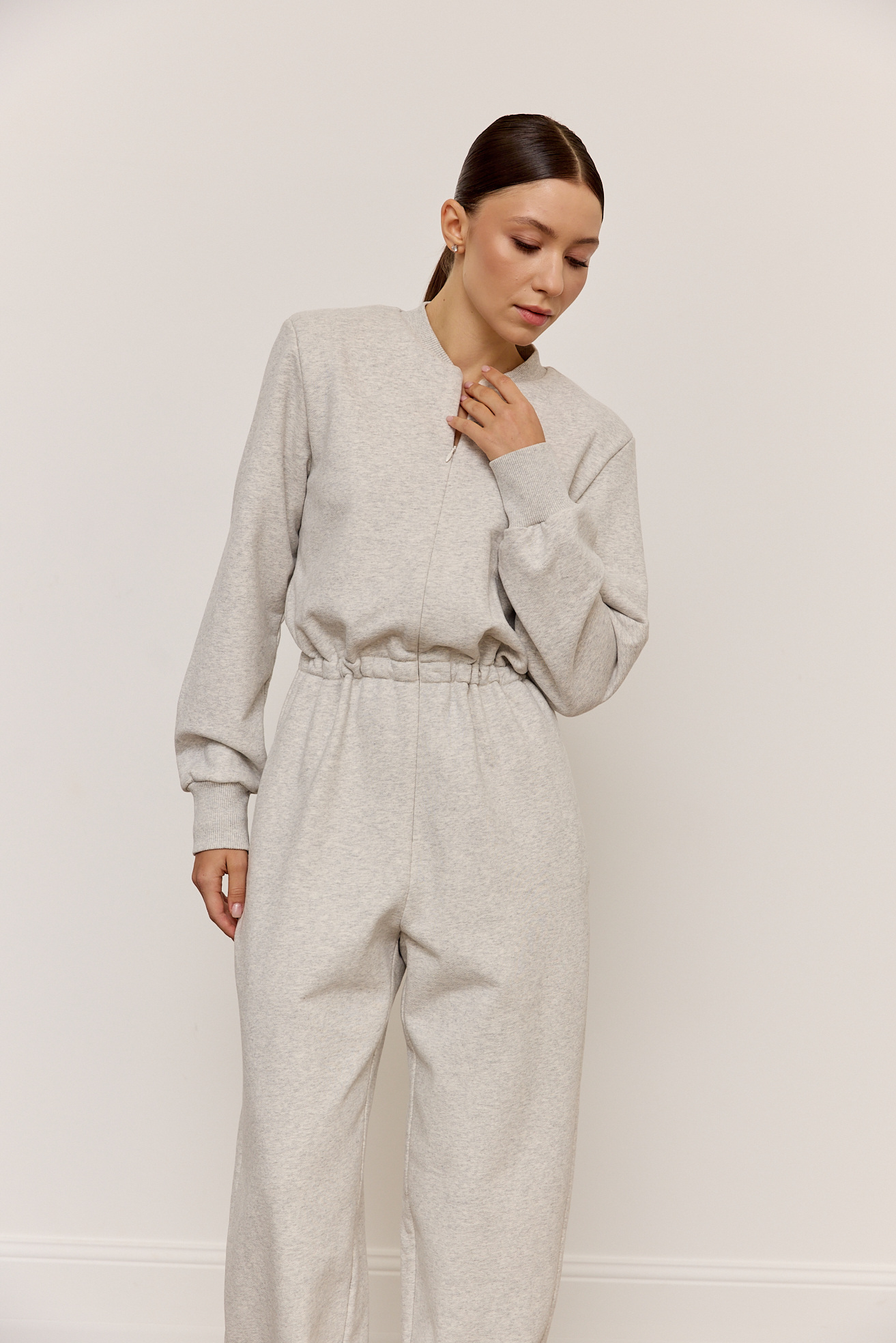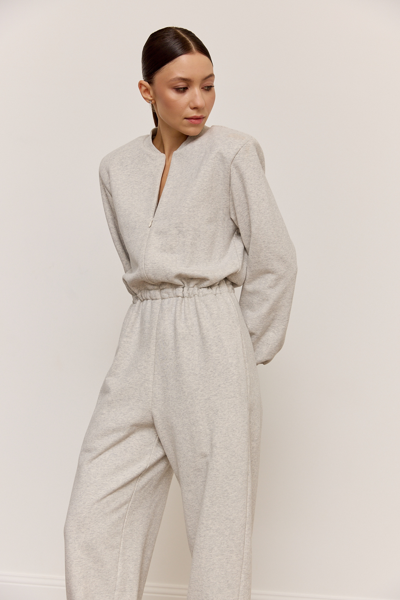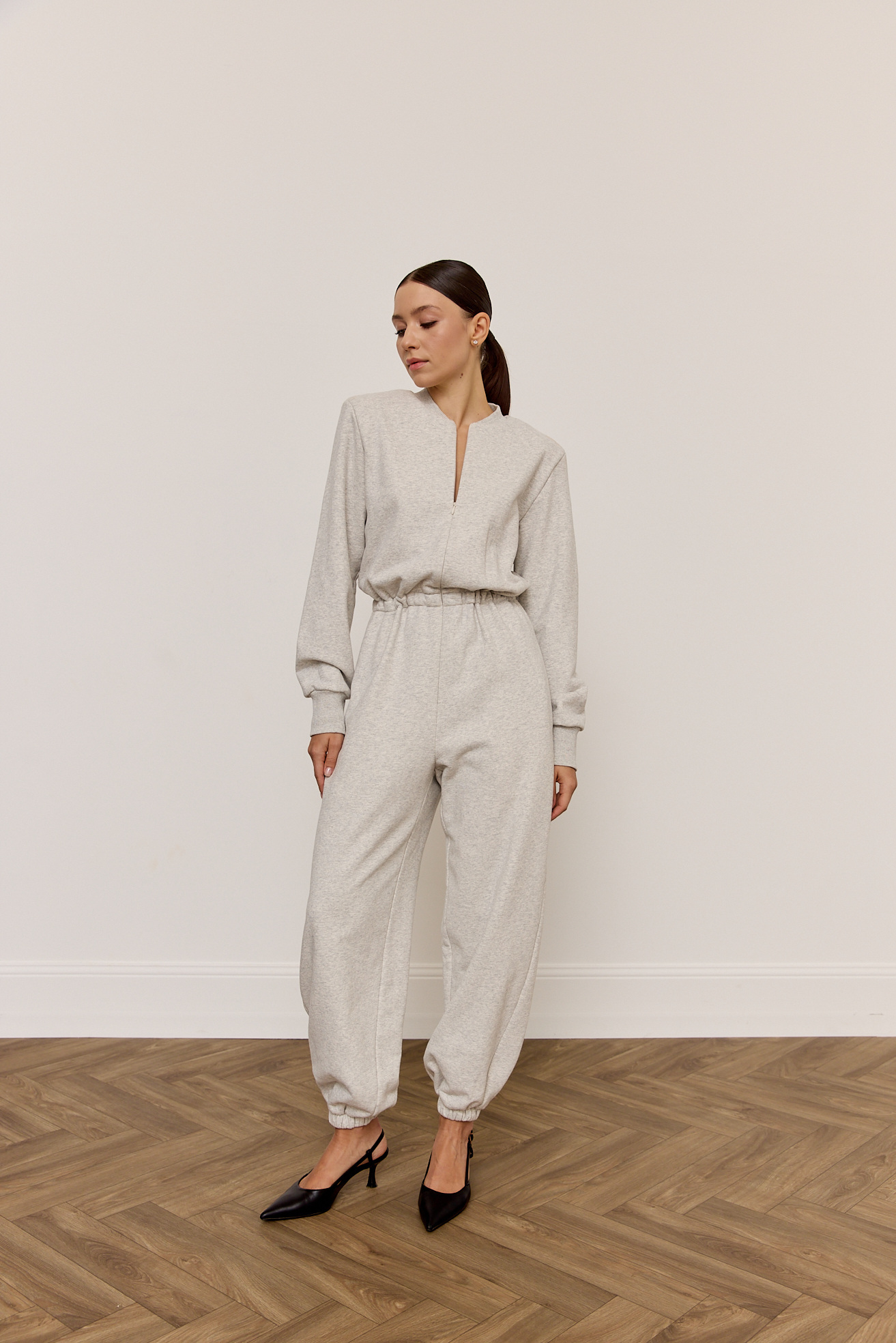 Спортивний комбінізон із щільного натурального трикотажу поєднує комфорт і сучасний дизайн. Верх моделі доповнений підплічниками, які додають образу актуальності та структури. Функціональний замочок забезпечує зручність, а талія на резинці підкреслює силует. Штани у фасоні джогерів із манжетами на затяжках  створюють стильний і практичний вигляд, завдяки чому комбінезон підходить як для активного відпочинку, так і для повсякденних образів.