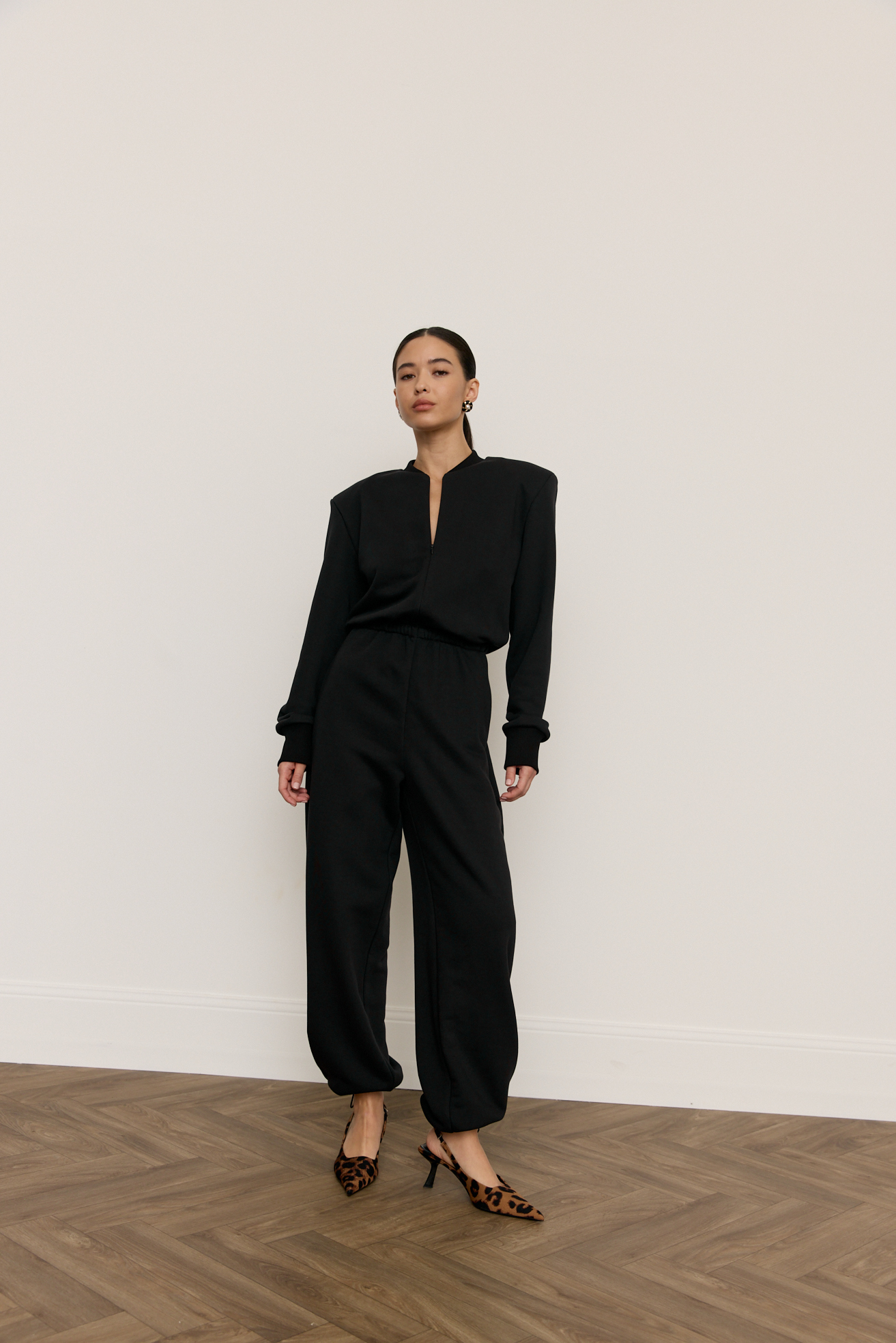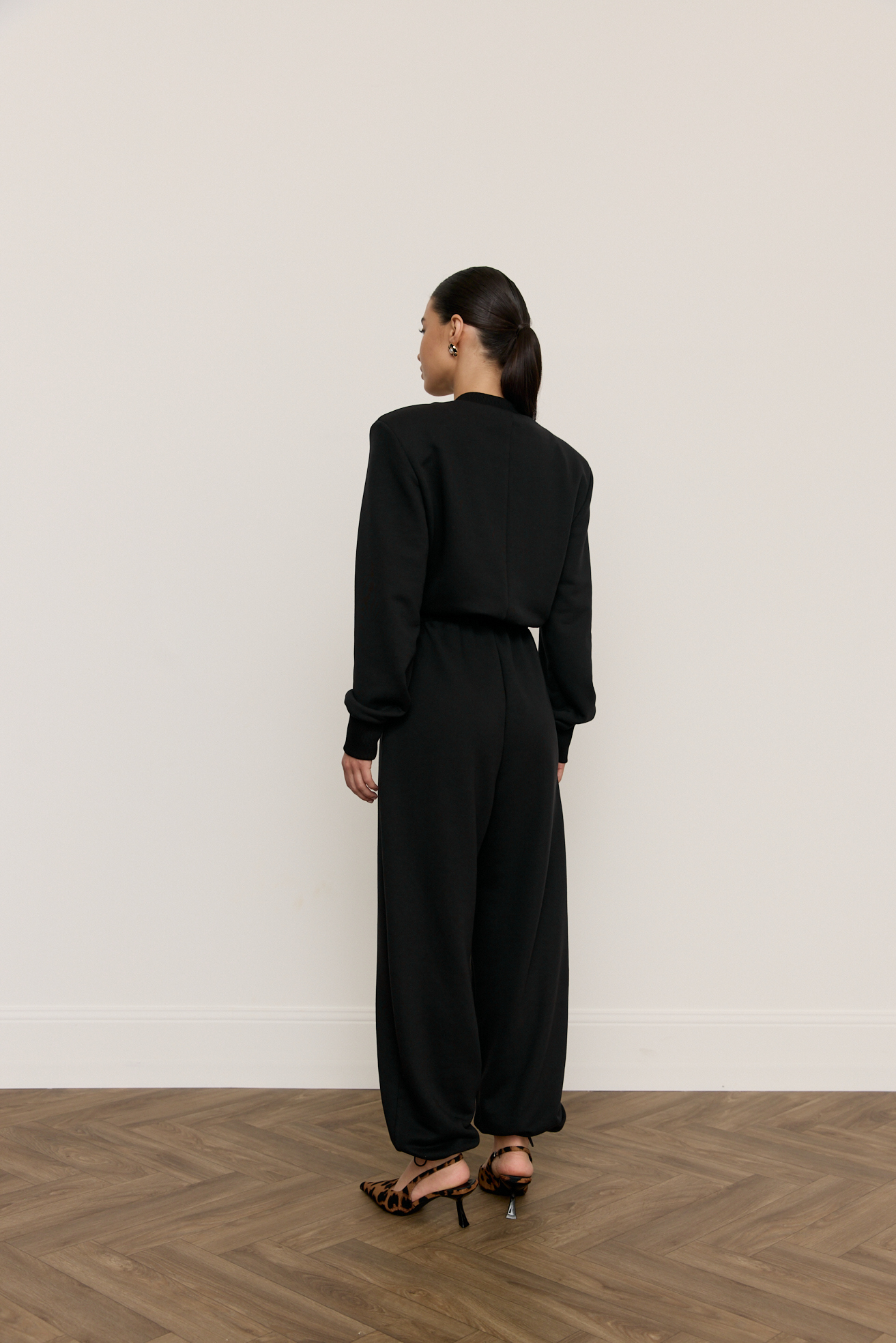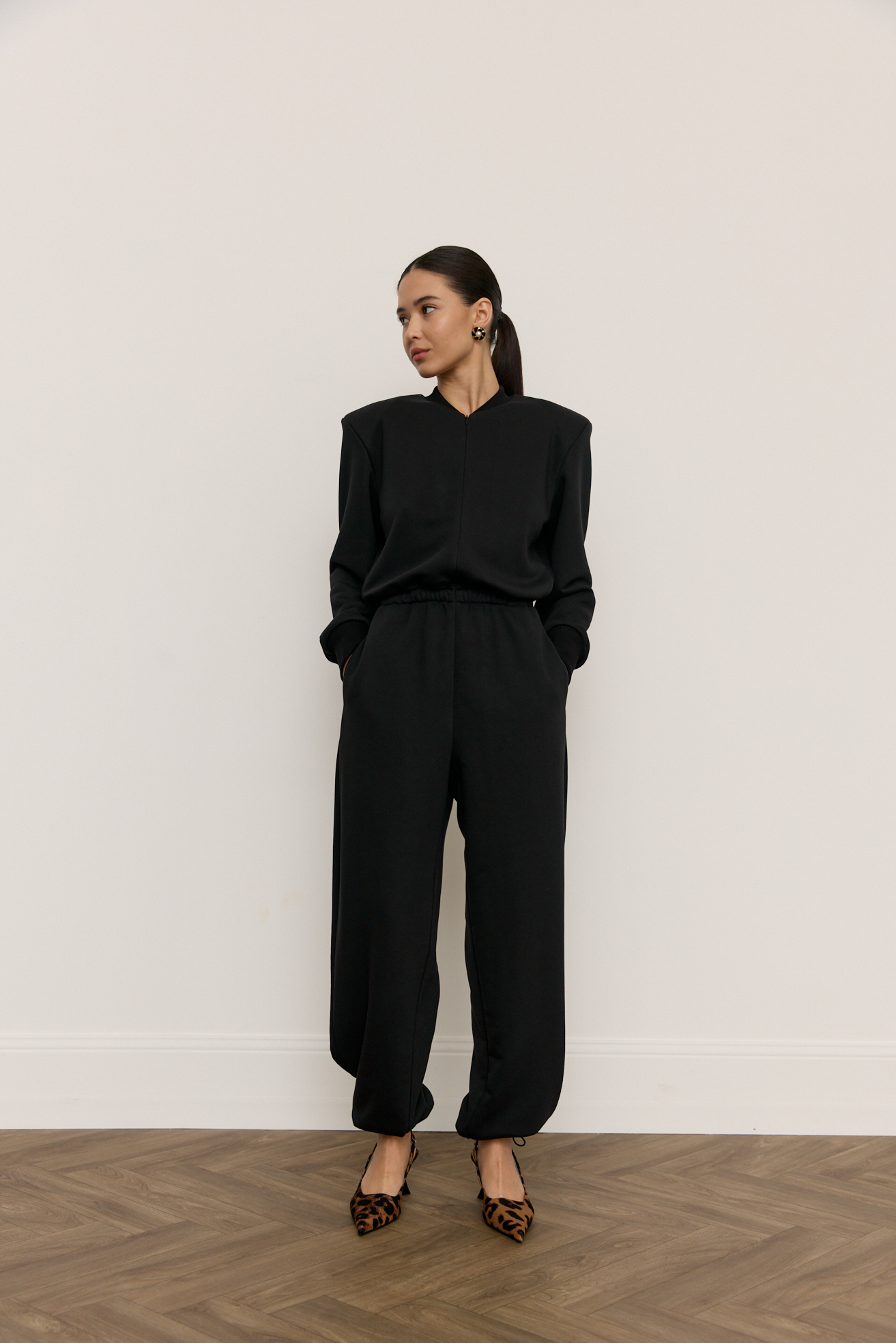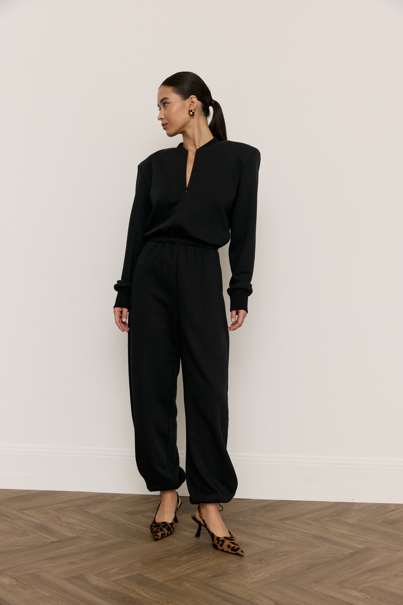 Спортивний комбінізон із щільного натурального трикотажу поєднує комфорт і сучасний дизайн. Верх моделі доповнений підплічниками, які додають образу актуальності та структури. Функціональний замочок забезпечує зручність, а талія на резинці підкреслює силует. Штани у фасоні джогерів із манжетами на затяжках  створюють стильний і практичний вигляд, завдяки чому комбінезон підходить як для активного відпочинку, так і для повсякденних образів.