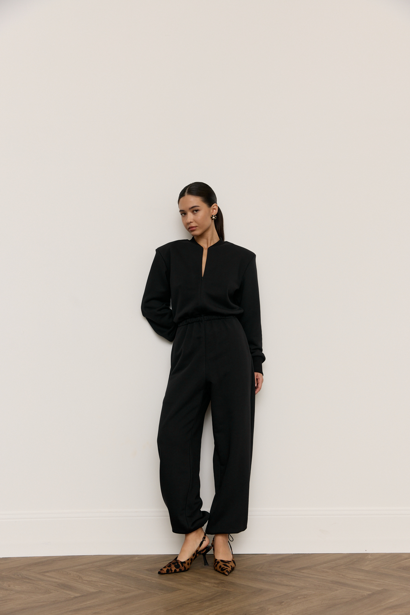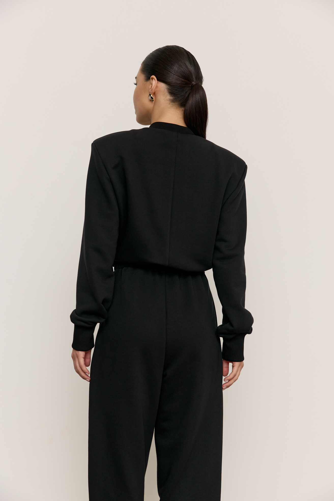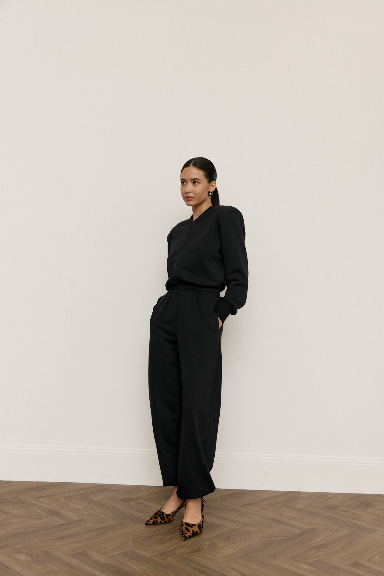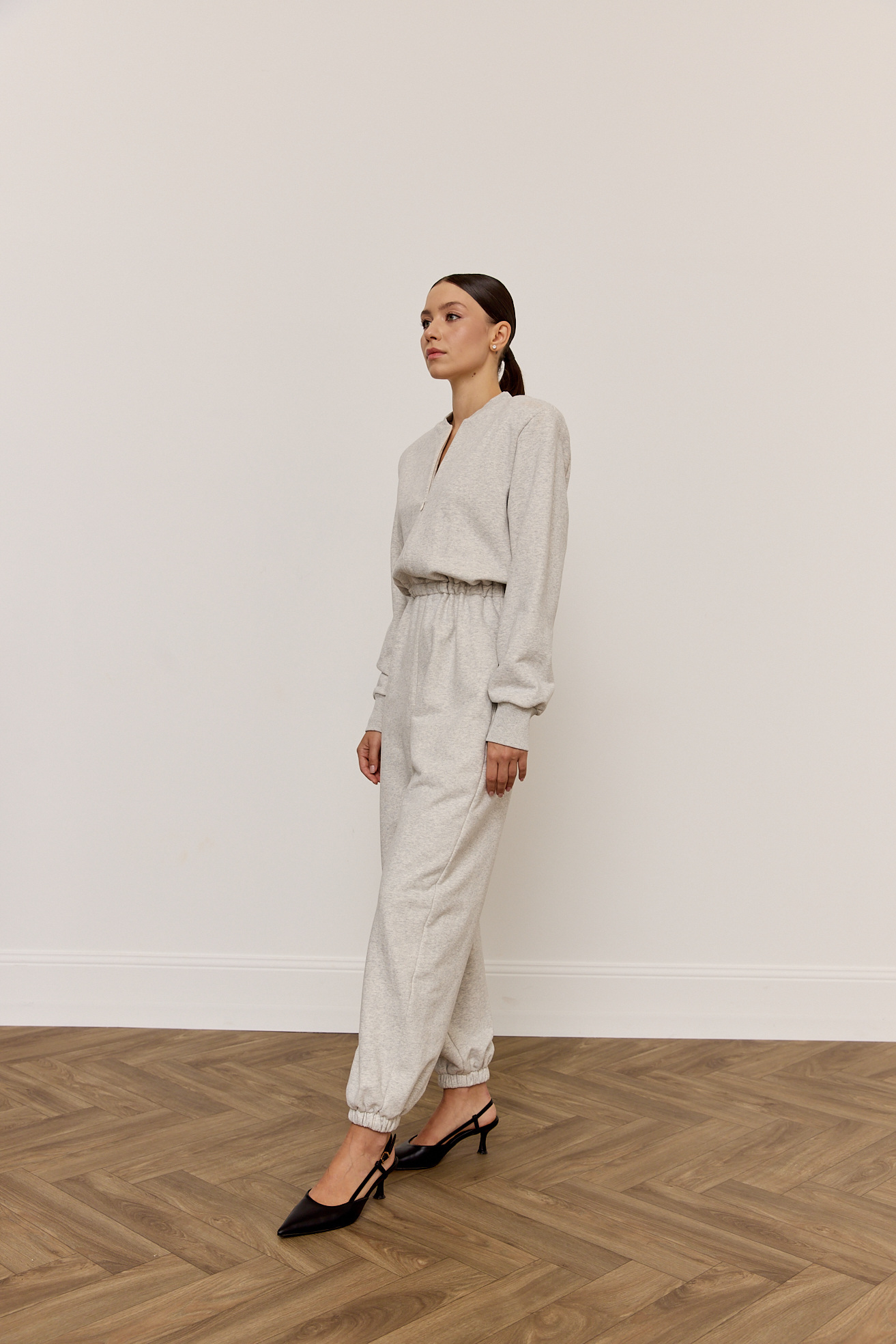 Спортивний комбінізон із щільного натурального трикотажу поєднує комфорт і сучасний дизайн. Верх моделі доповнений підплічниками, які додають образу актуальності та структури. Функціональний замочок забезпечує зручність, а талія на резинці підкреслює силует. Штани у фасоні джогерів із манжетами на затяжках  створюють стильний і практичний вигляд, завдяки чому комбінезон підходить як для активного відпочинку, так і для повсякденних образів.