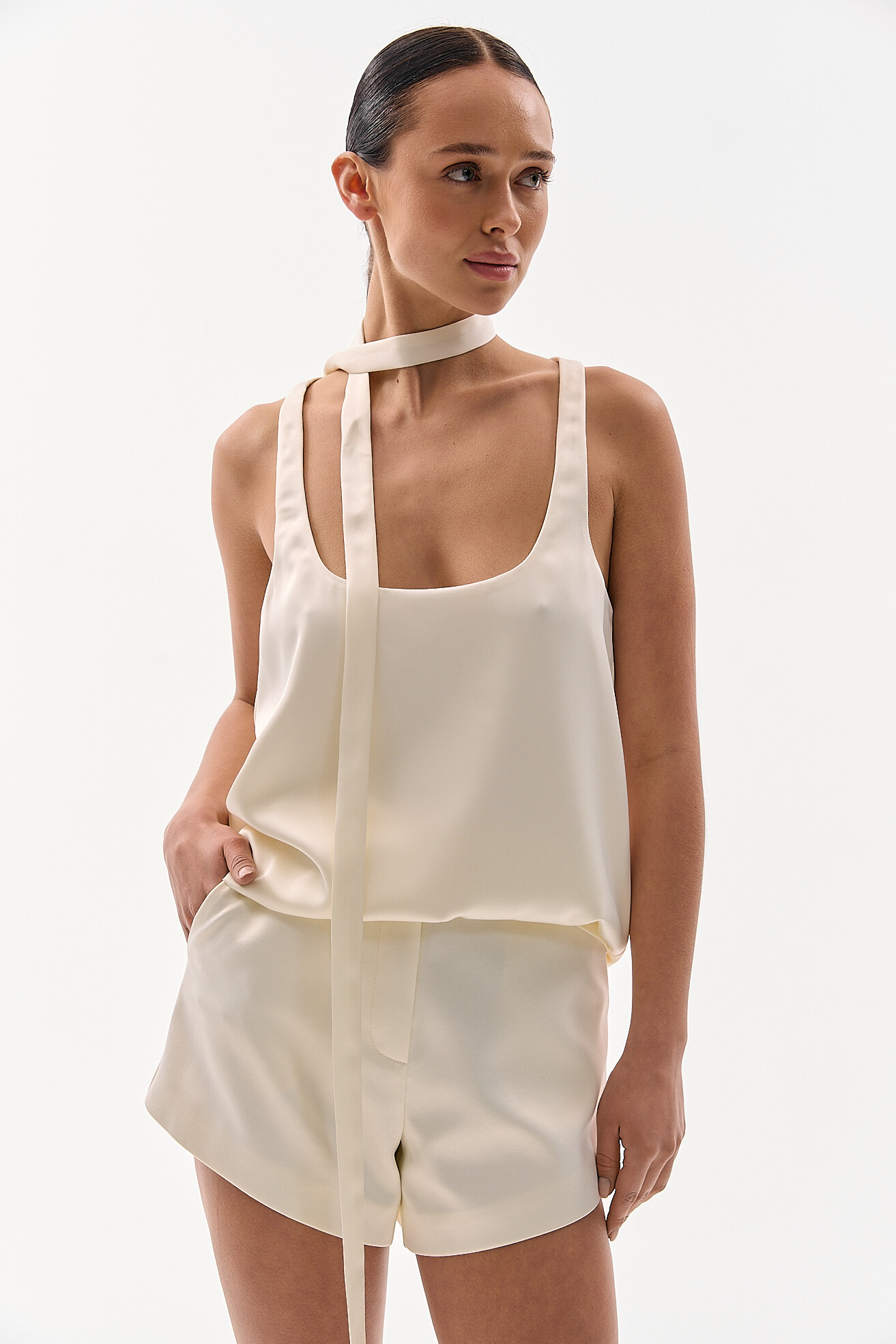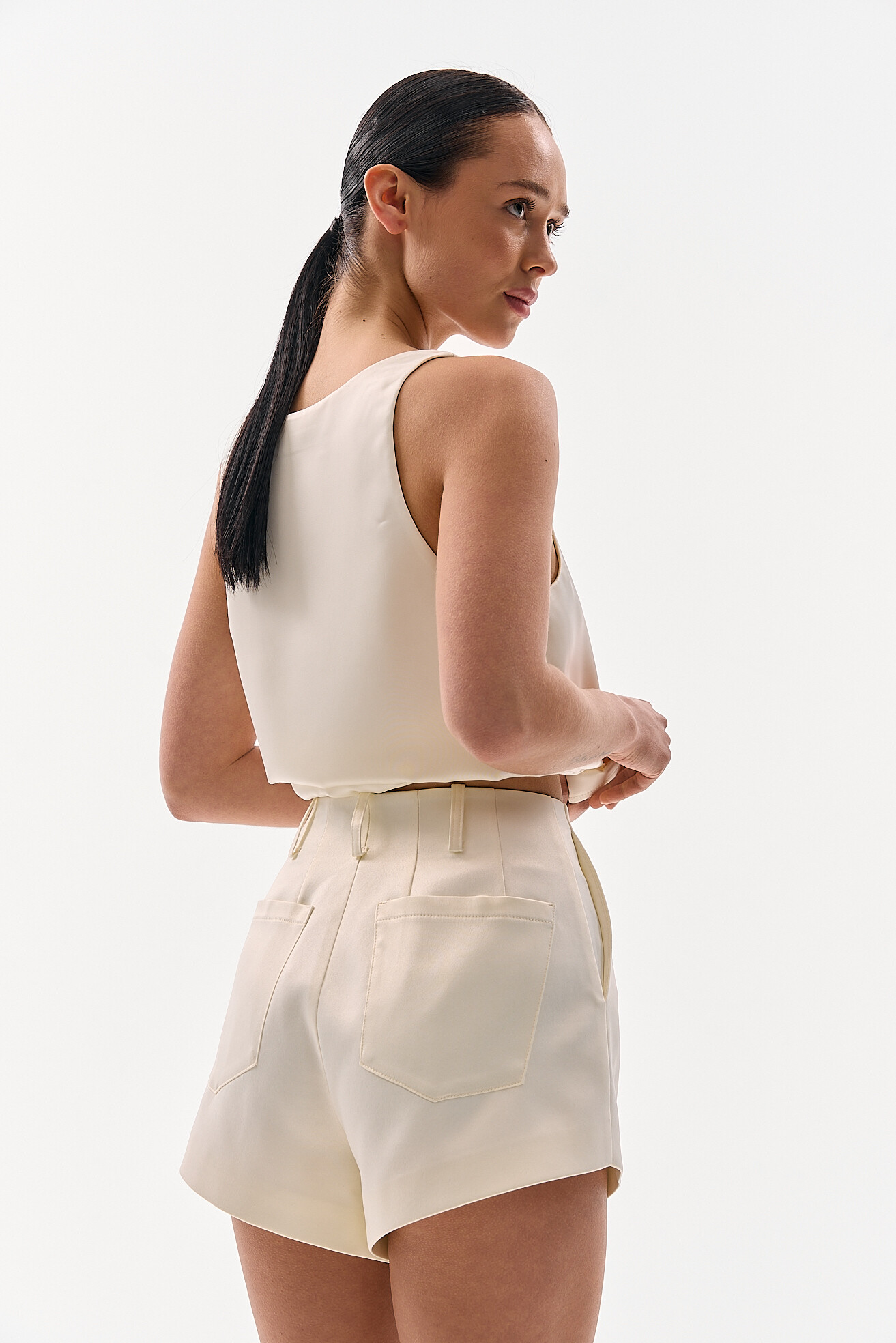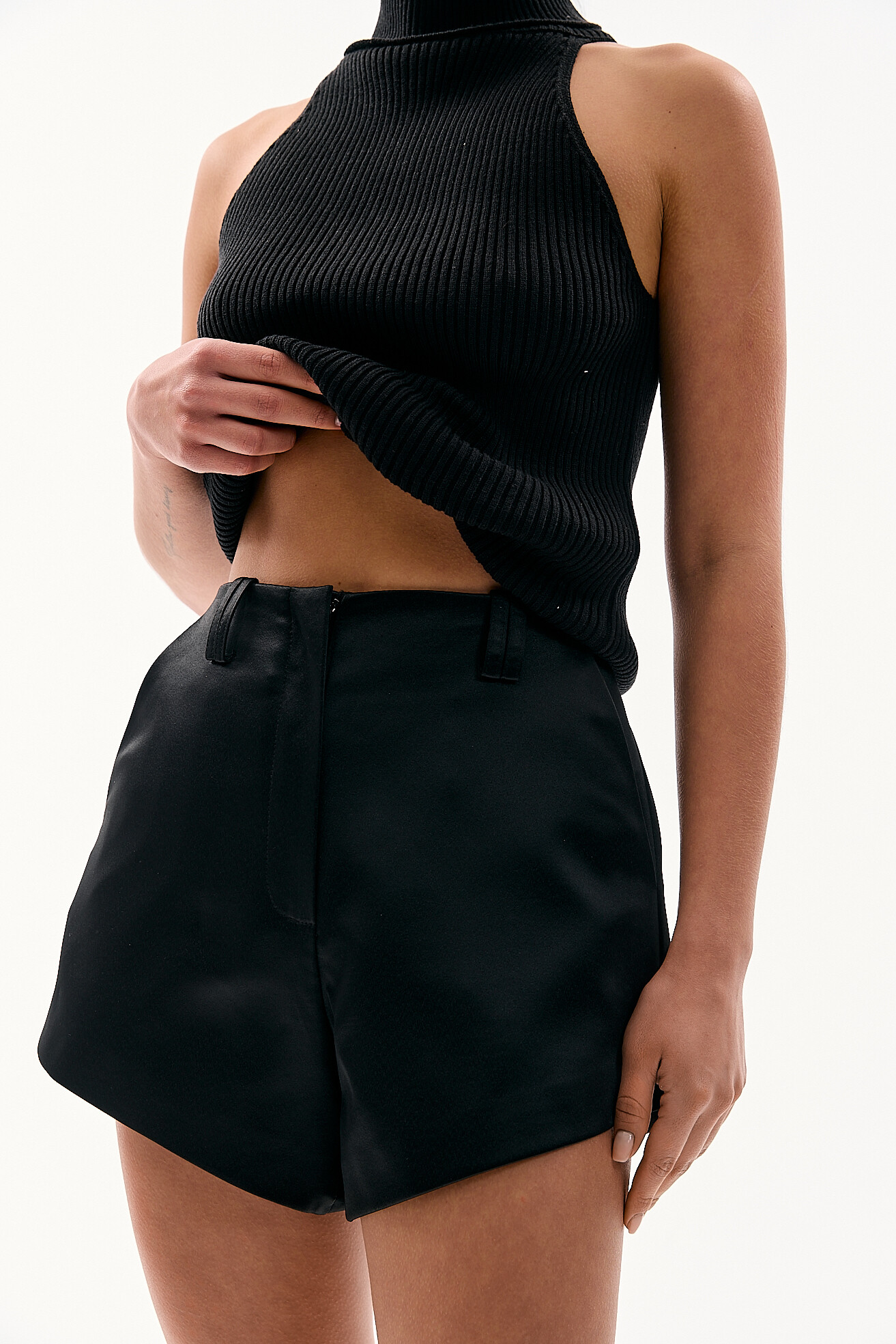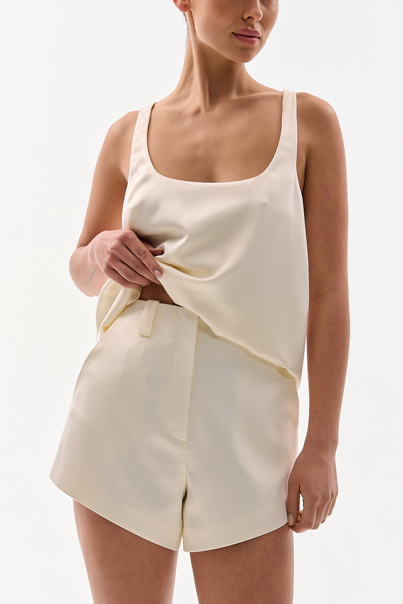 Модель міні-шортів із класичним поясом виконана зі щільного сатину на підкладці, завдяки чому добре тримає форму. Ми продумали її як частину комплекту з нашим бомбером - разом вони створюють стильний і цілісний образ. Водночас шорти виглядають дорого й самодостатньо завдяки чіткій, структурній формі. Вишуканий мінімалізм для сучасного гардероба.