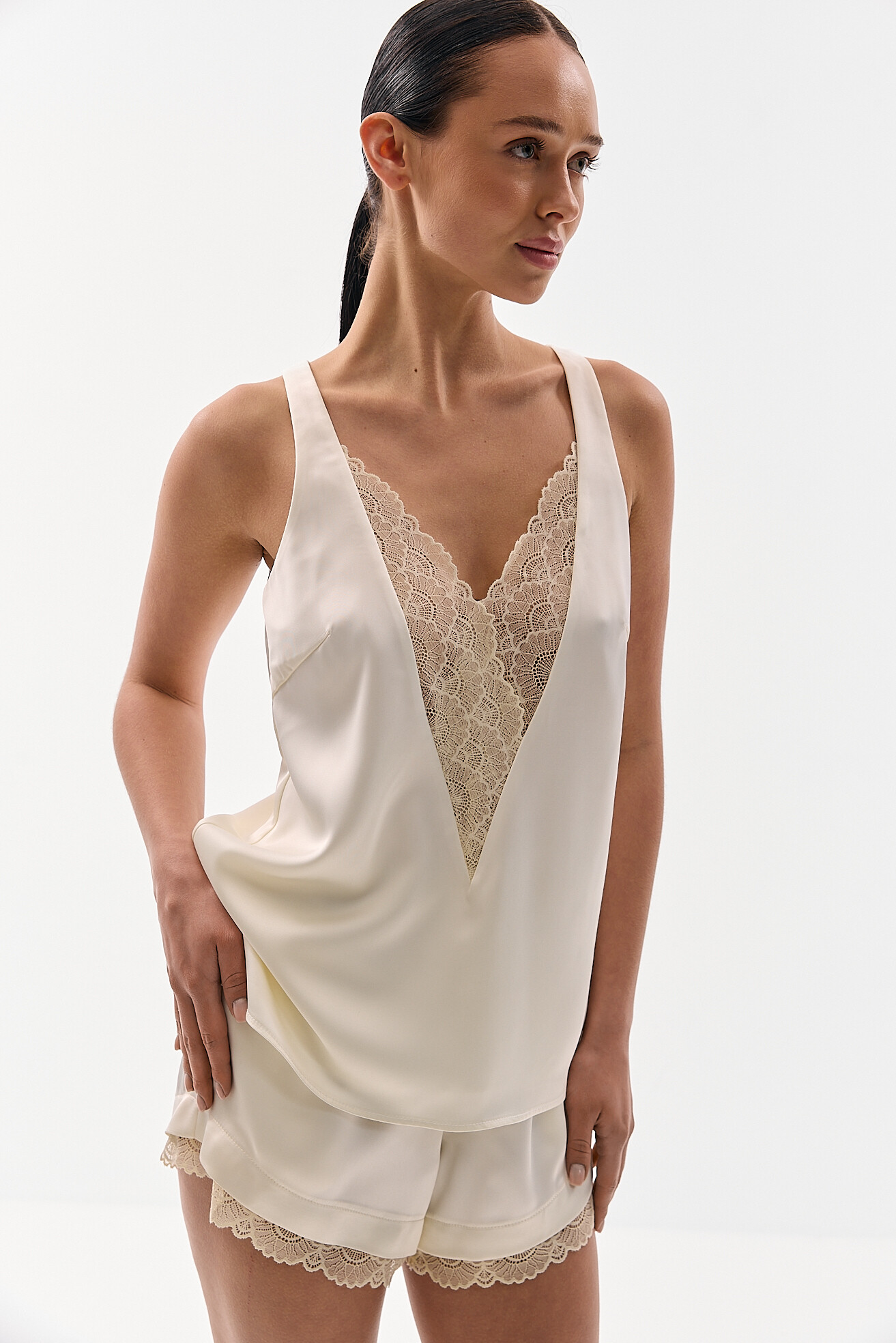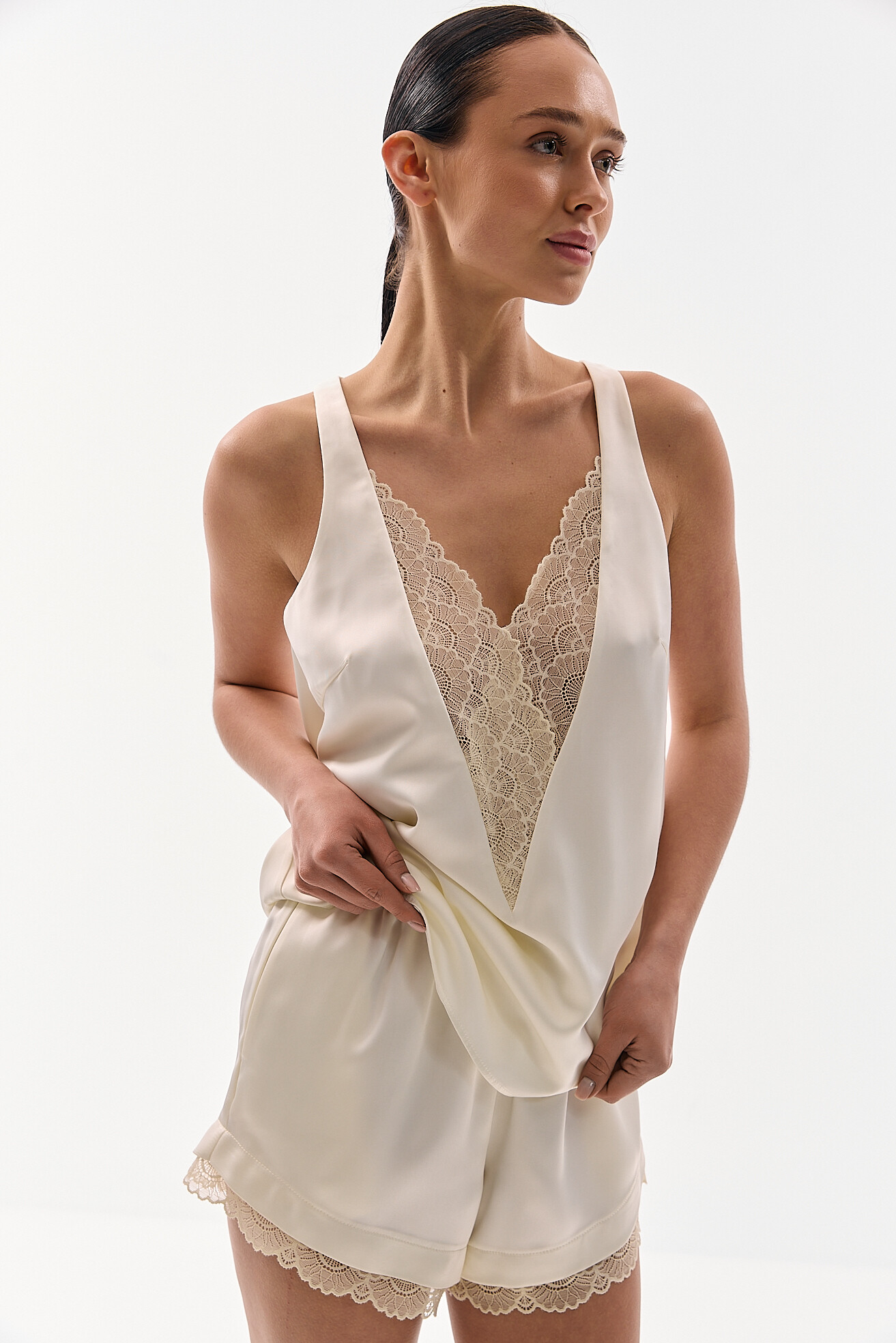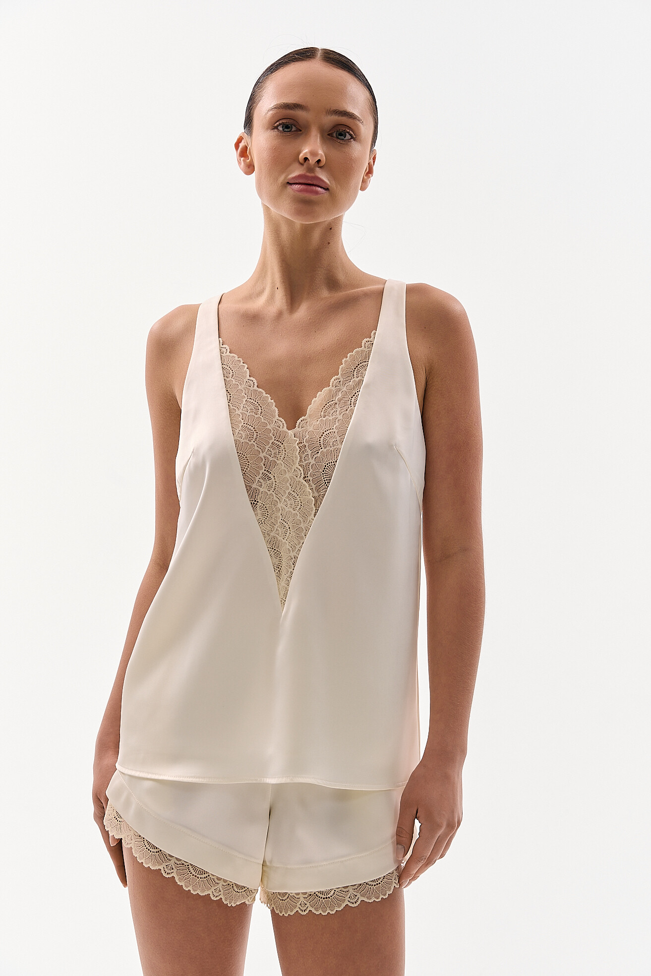 Майка з мереживом - базова річ, яка водночас додає образу акценту. Ми виконали її у вільному фасоні та доповнили акуратним, ненав’язливим мереживом. Завдяки цьому модель виглядає легко, сучасно та жіночно. Її можна поєднувати з нашими шортами з таким же мереживом або обирати більш стримані варіанти, наприклад, класичні сатинові штани.