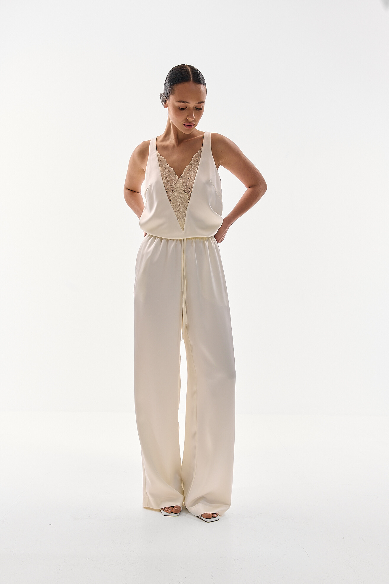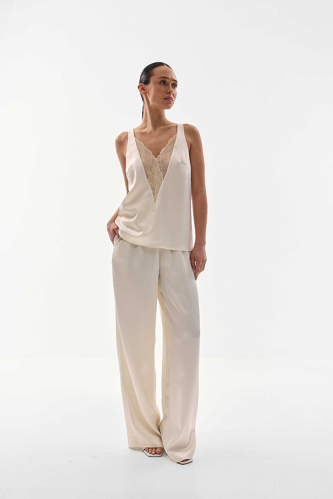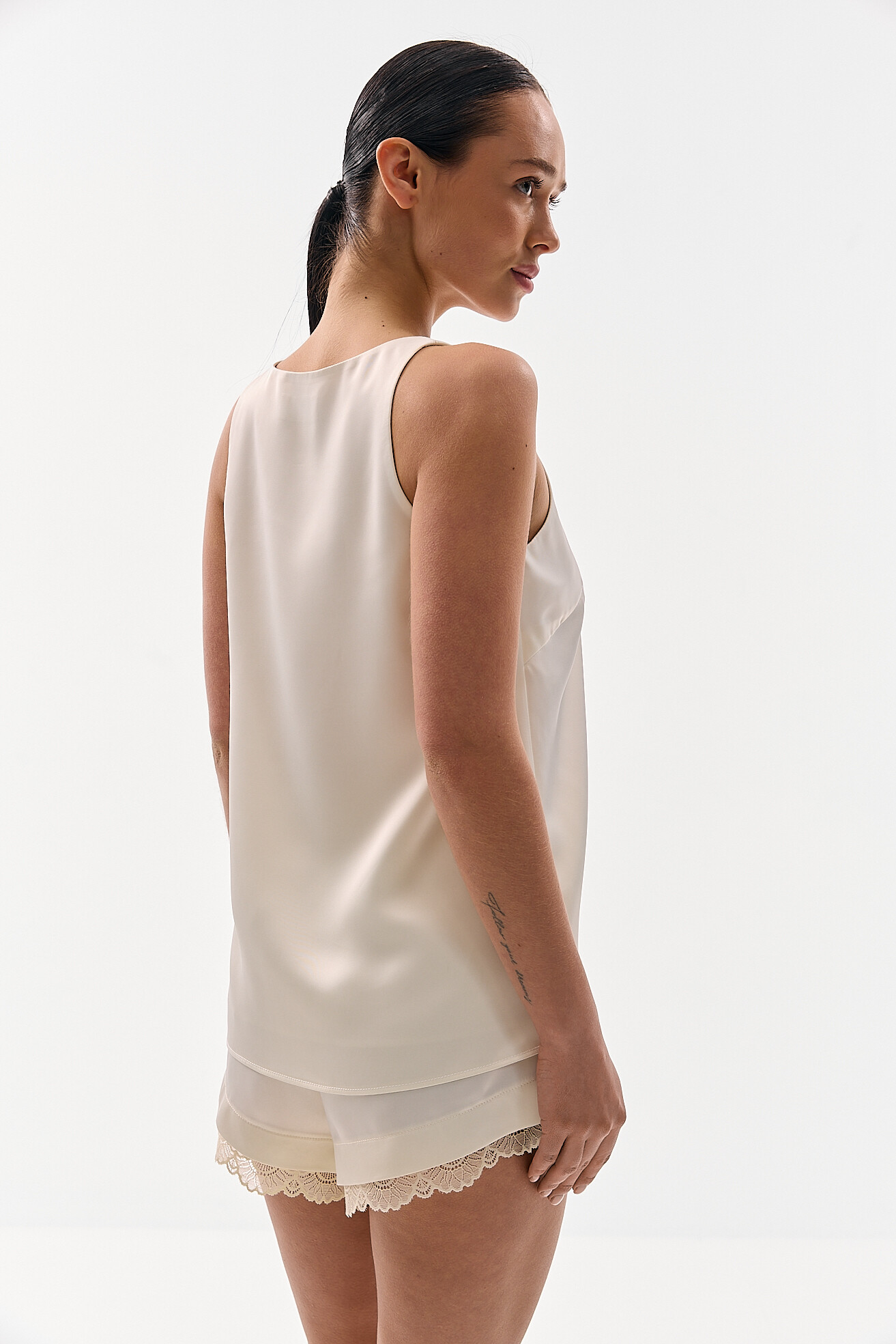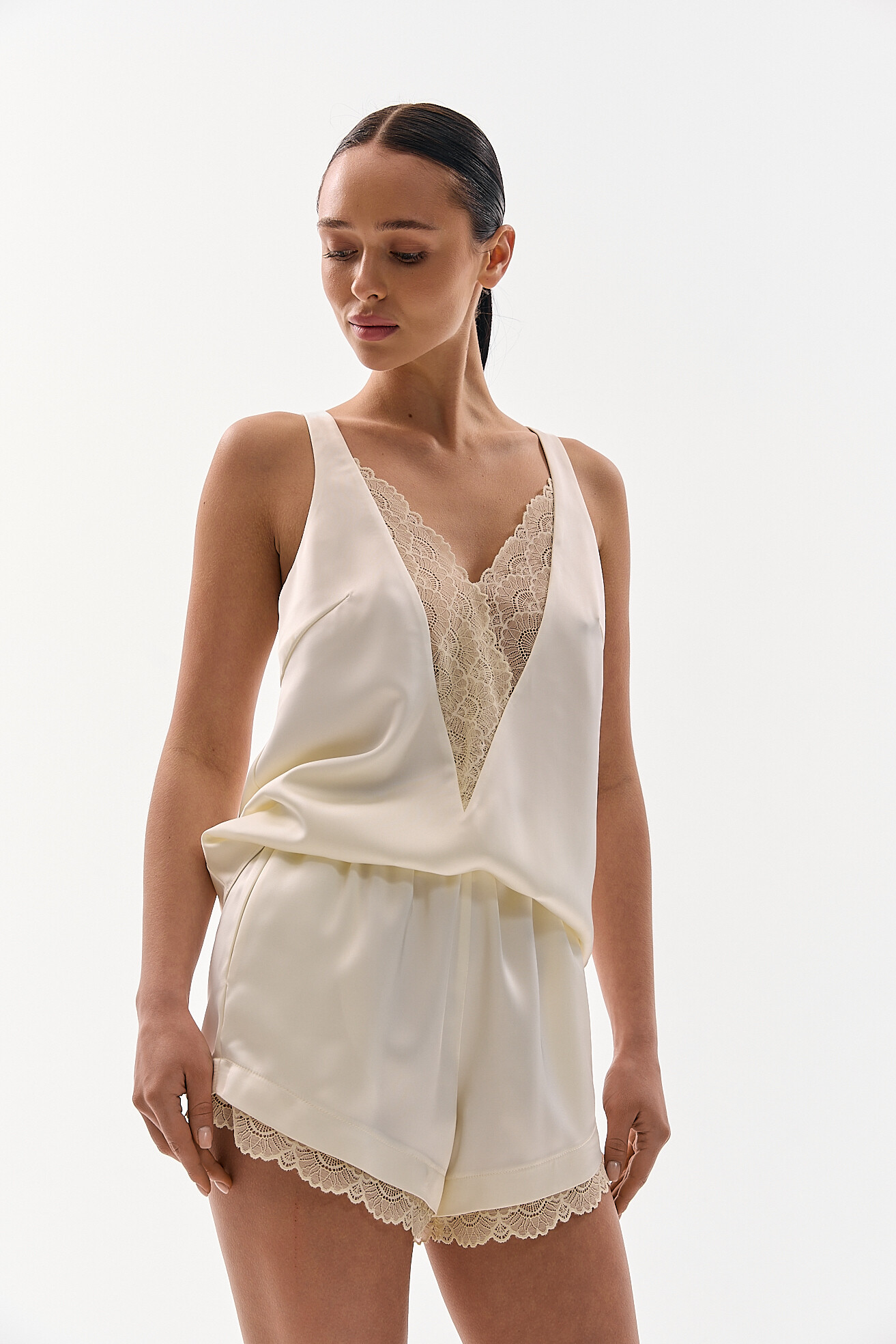 Майка з мереживом - базова річ, яка водночас додає образу акценту. Ми виконали її у вільному фасоні та доповнили акуратним, ненав’язливим мереживом. Завдяки цьому модель виглядає легко, сучасно та жіночно. Її можна поєднувати з нашими шортами з таким же мереживом або обирати більш стримані варіанти, наприклад, класичні сатинові штани.