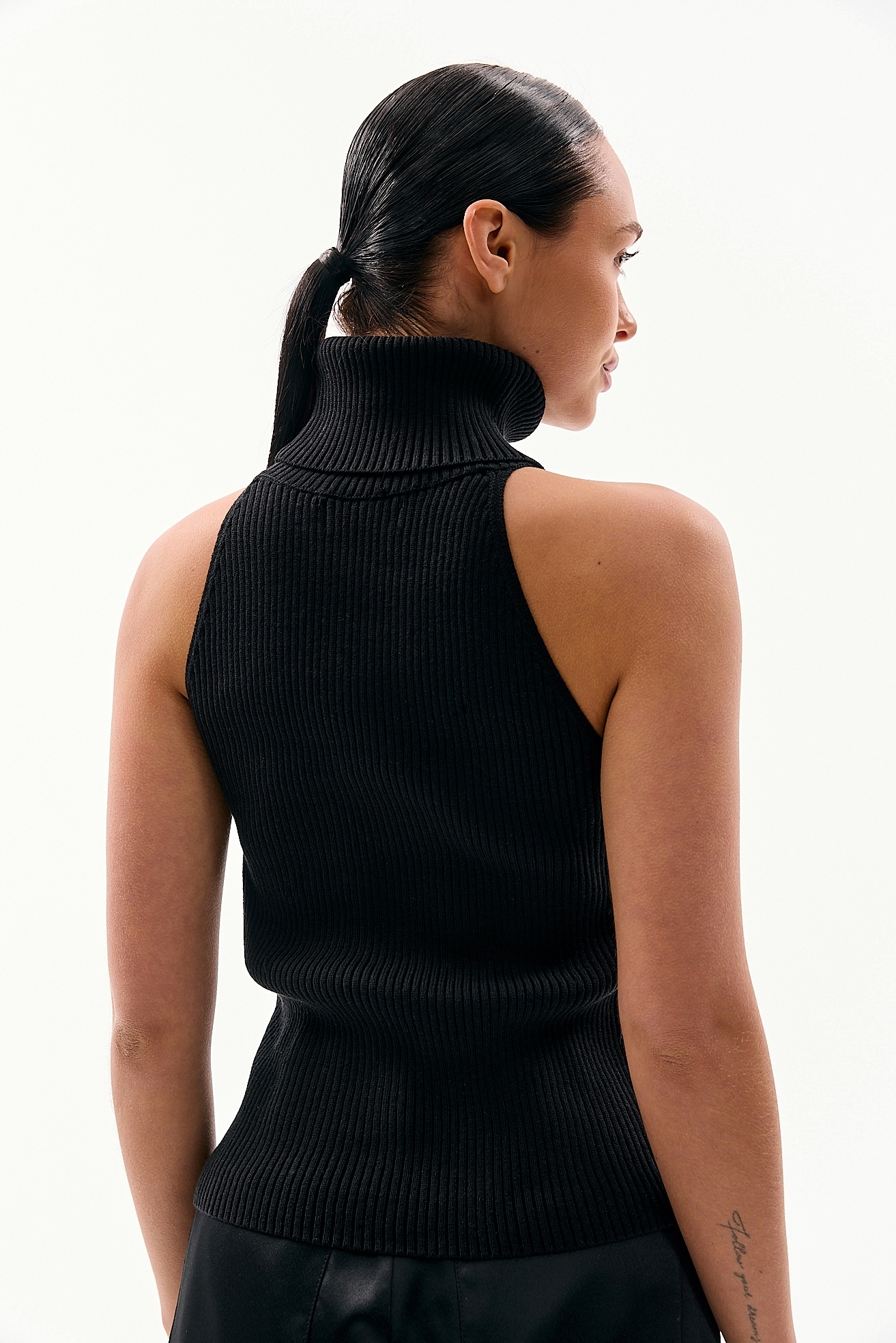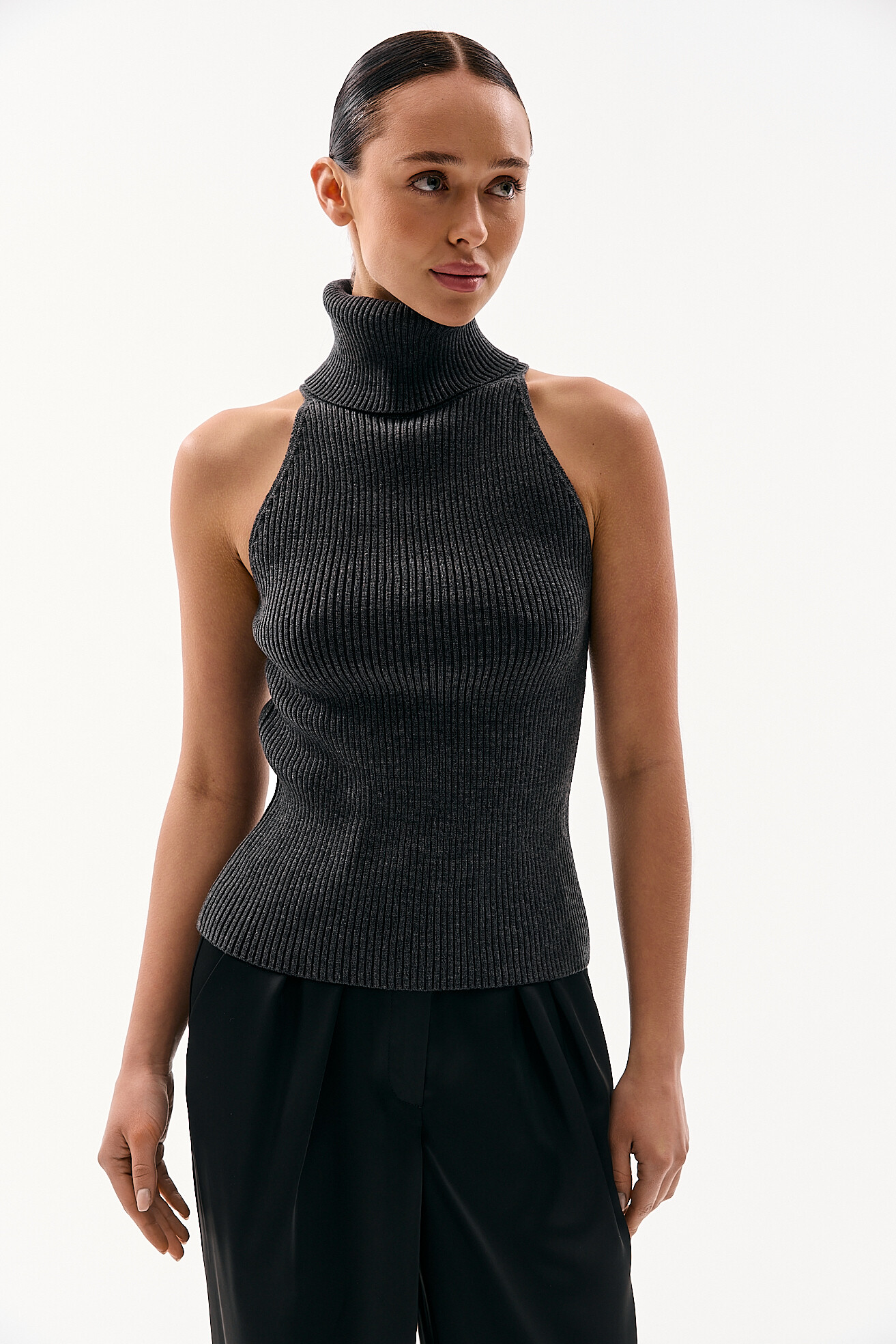 В’язаний топ із високою горловиною — актуальна модель цього сезону. Він добре підходить як для міжсезоння, так і для теплого періоду. Виконаний із приємної бавовняної в’язки, яка м’яка до тіла та добре тягнеться. Зручна й універсальна річ для щоденних образів.