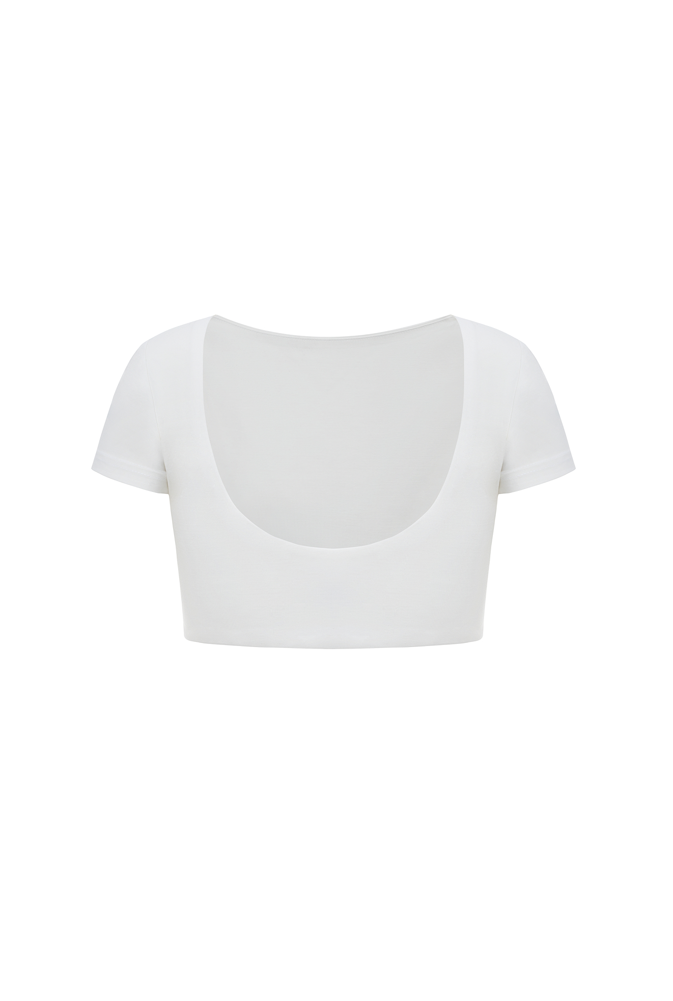 Футболка-топ  вкороченої довжини, що має акцентний виріз по спинці, який додає їй цікавості. Приємна еластична тканина гарно обтягує фігуру та комфортна у щоденному носінні. Топ виконаний з подвійної тканини.