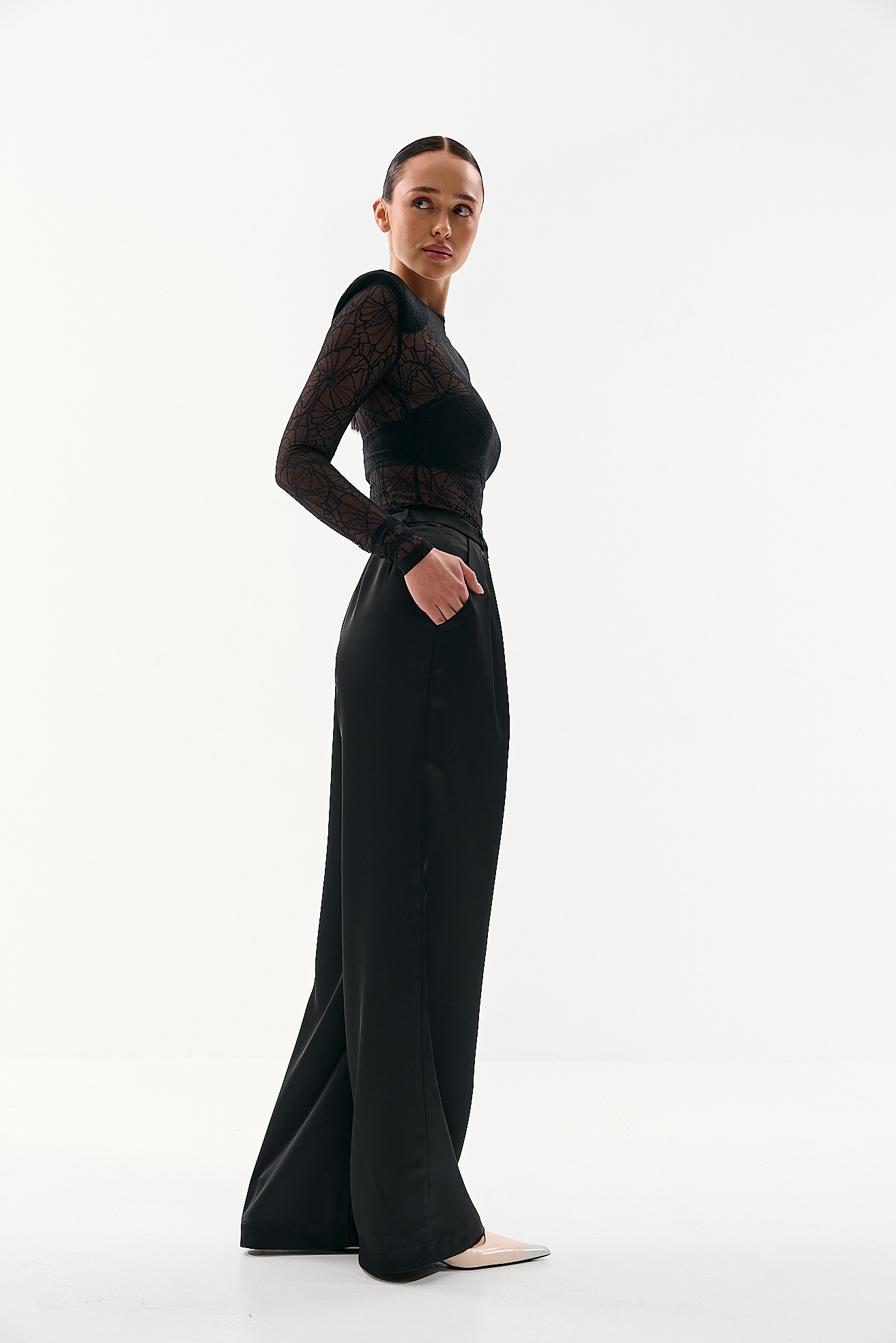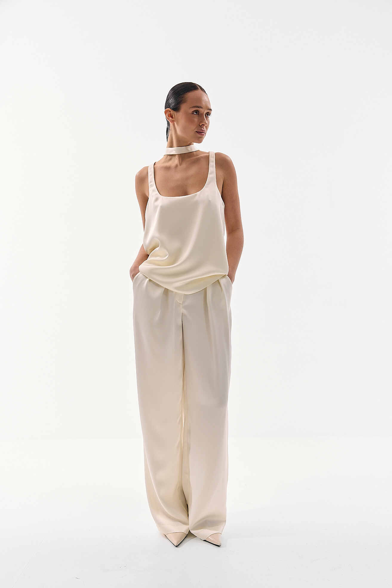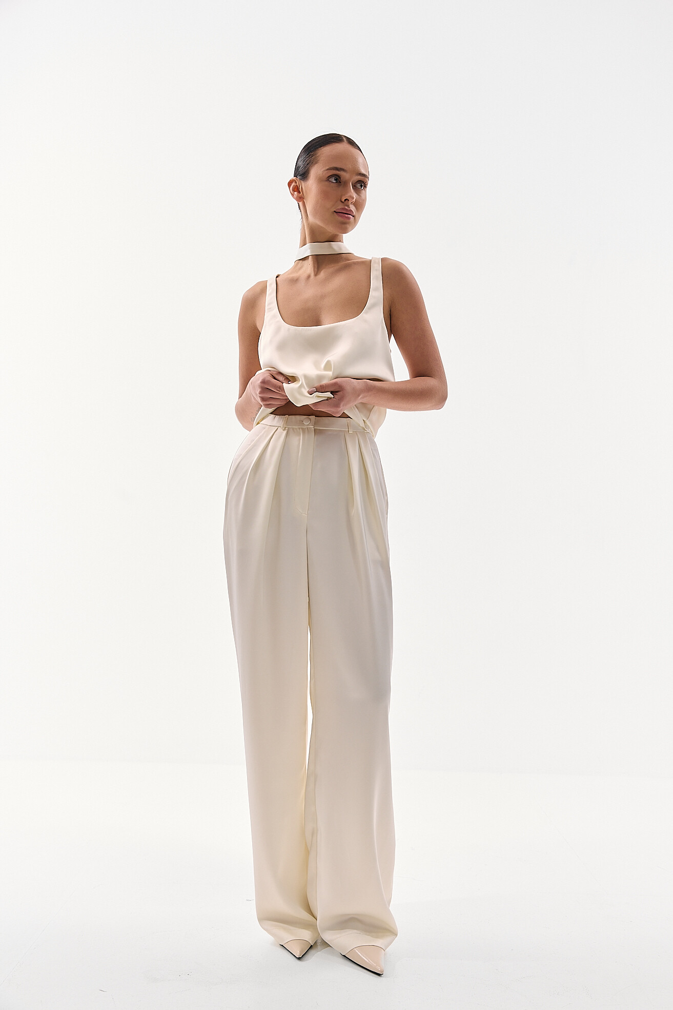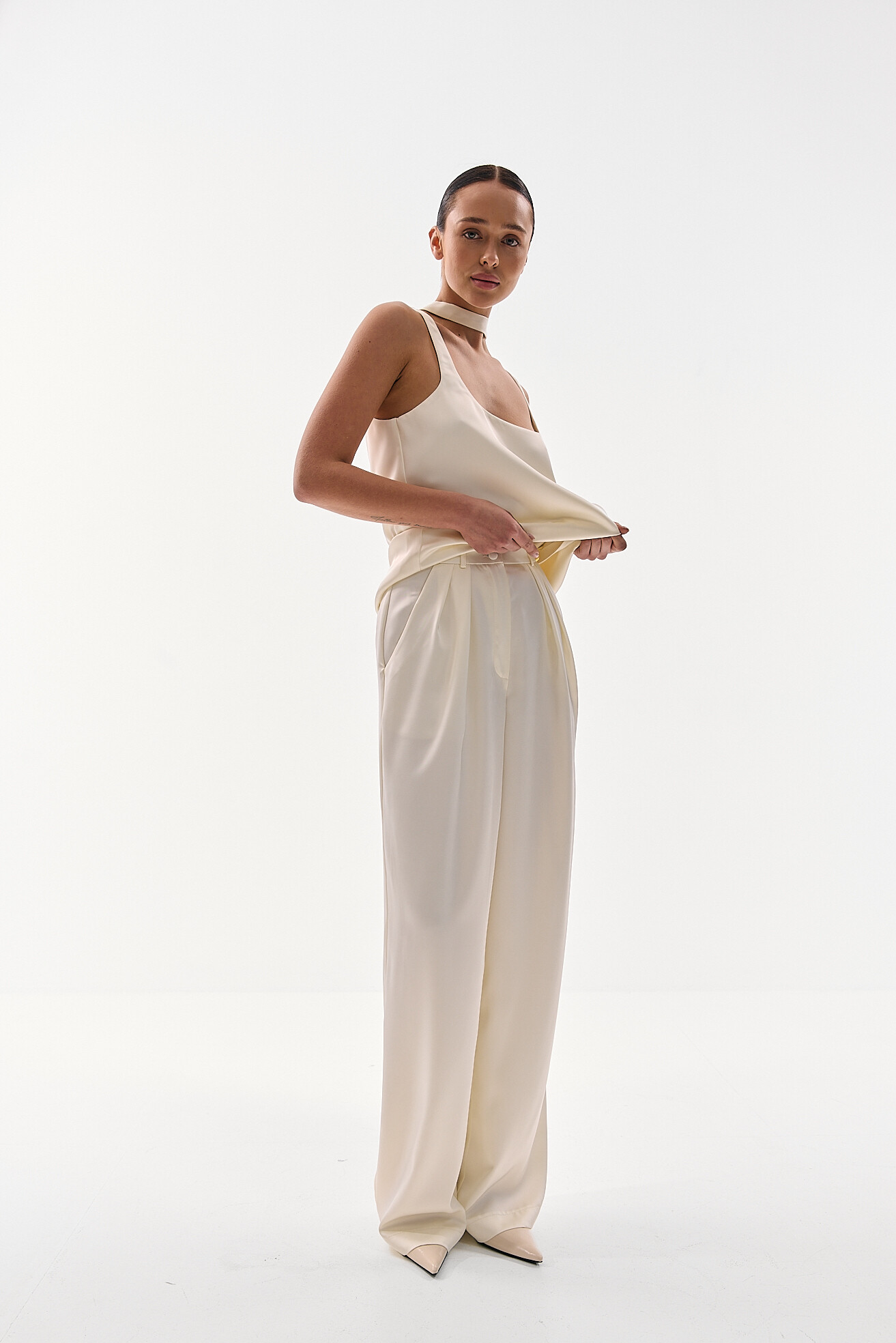 Для прихильниць класичних образів ми розробили модель палаццо у легкій сатиновій тканині. Ми хотіли зберегти відчуття зібраності та елегантності, але адаптувати його до весняно-літнього сезону. Легка тканина забезпечує комфорт у теплу погоду, а делікатний сатиновий блиск додає виробу вишуканості без зайвої акцентності. Це варіант, який виглядає стильно та доречно у будь-якій ситуації.