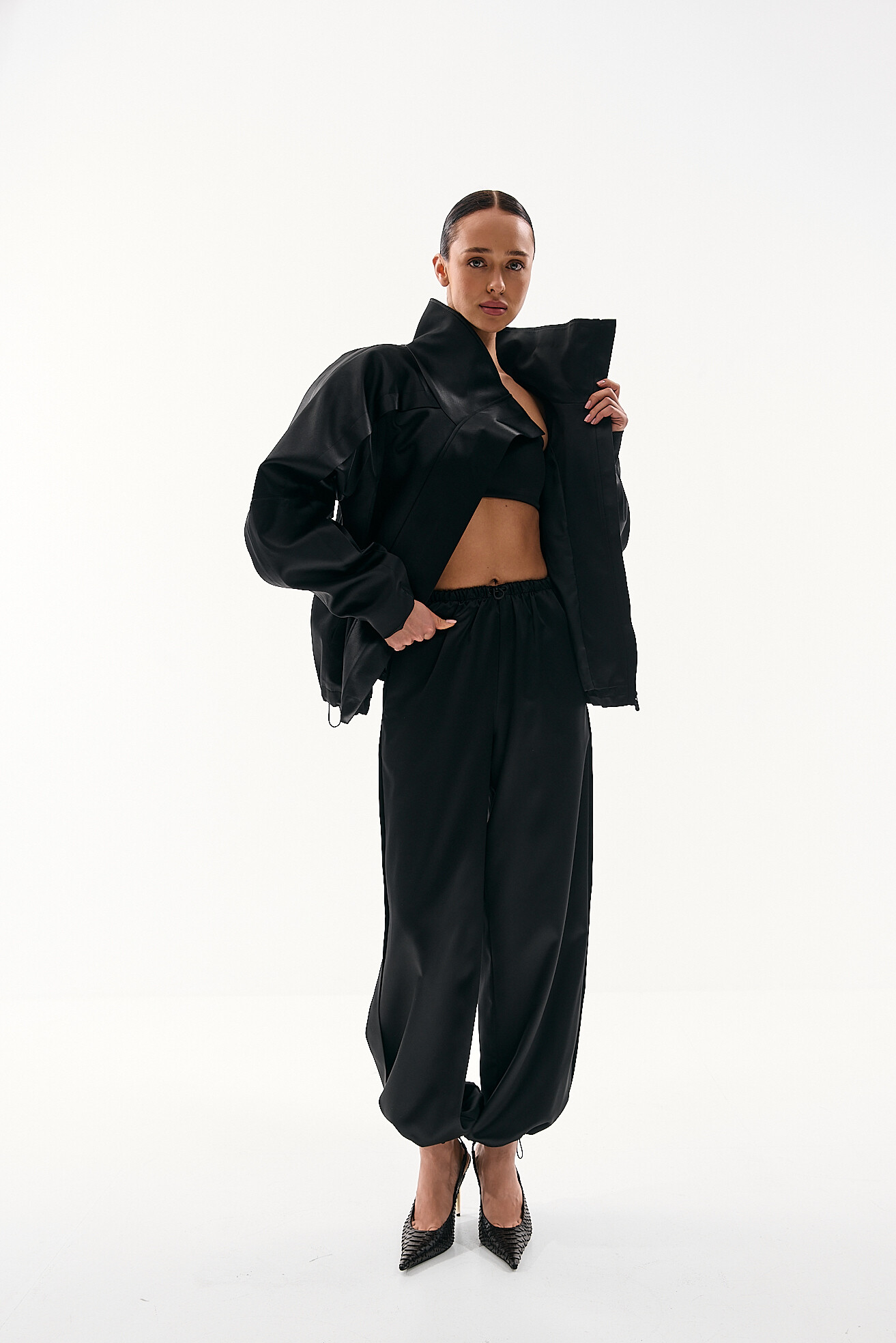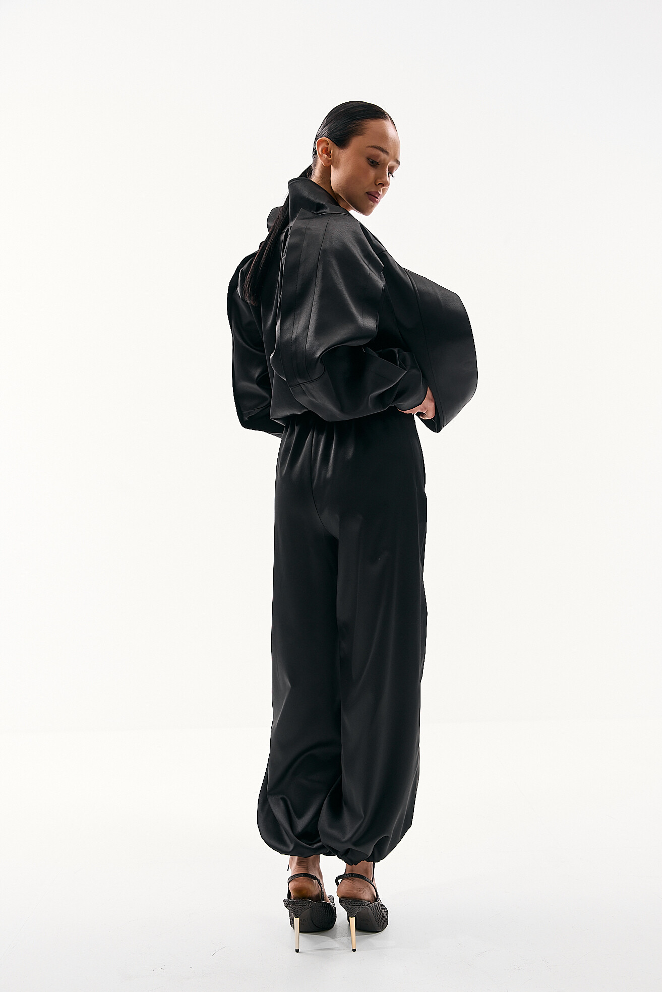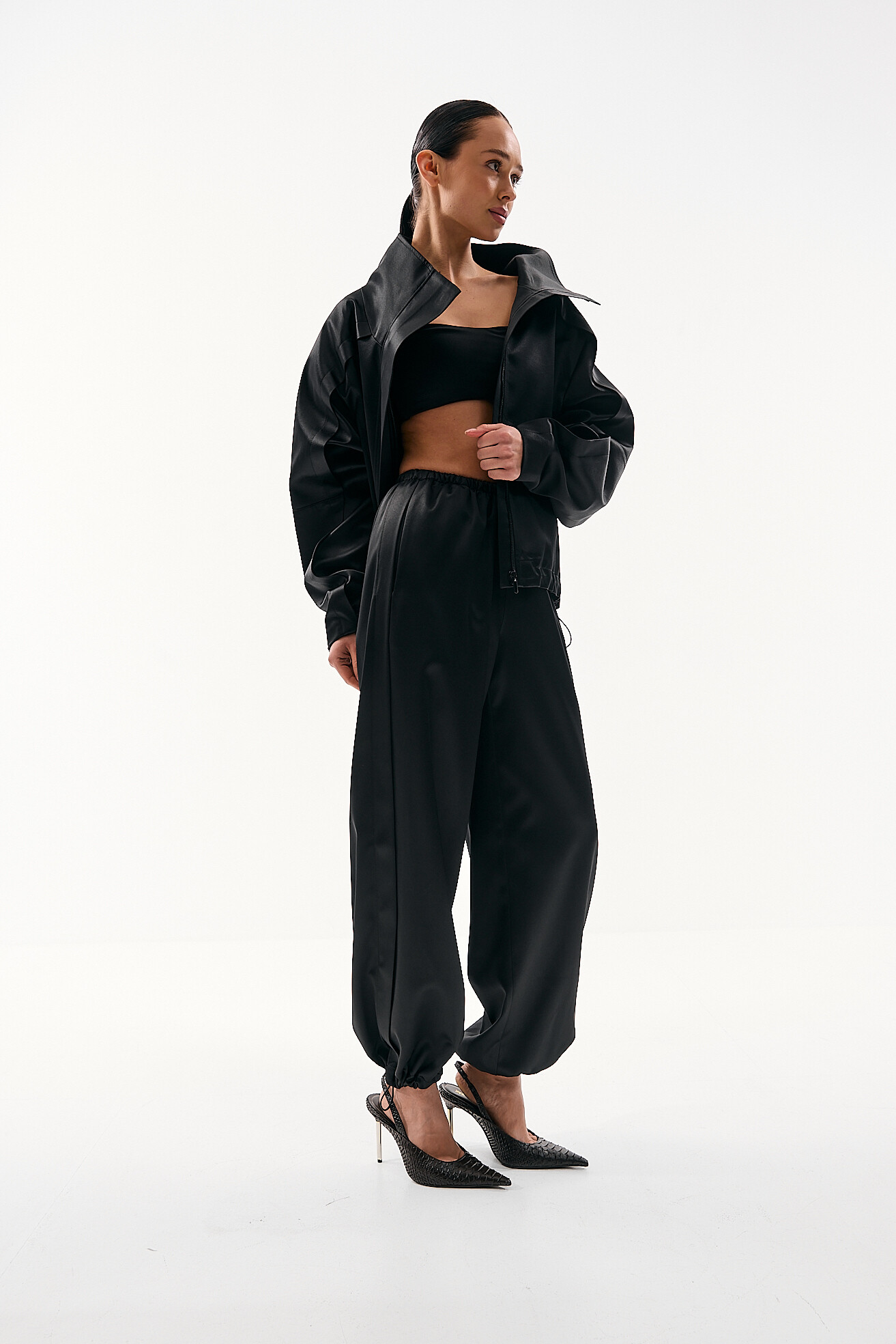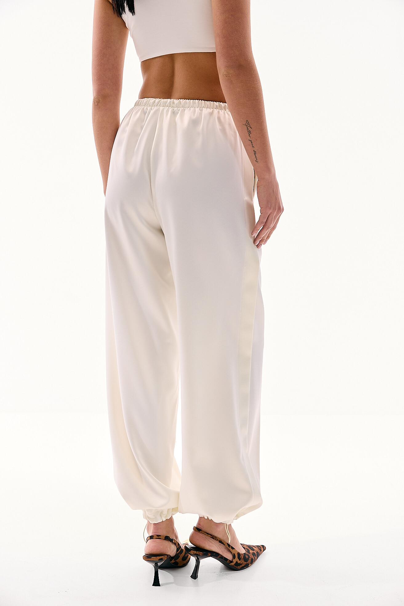 Актуальне рішення на цю весну — штани-джогери в сатиновій фактурі. Легка, вільна модель ідеально підходить для весняно-літнього періоду та комфортна у спеку. Зберігаючи звичну базову форму, штани доповнені цікавими деталями у вигляді лампасів по боках. Стильний і зручний варіант для щоденних образів.