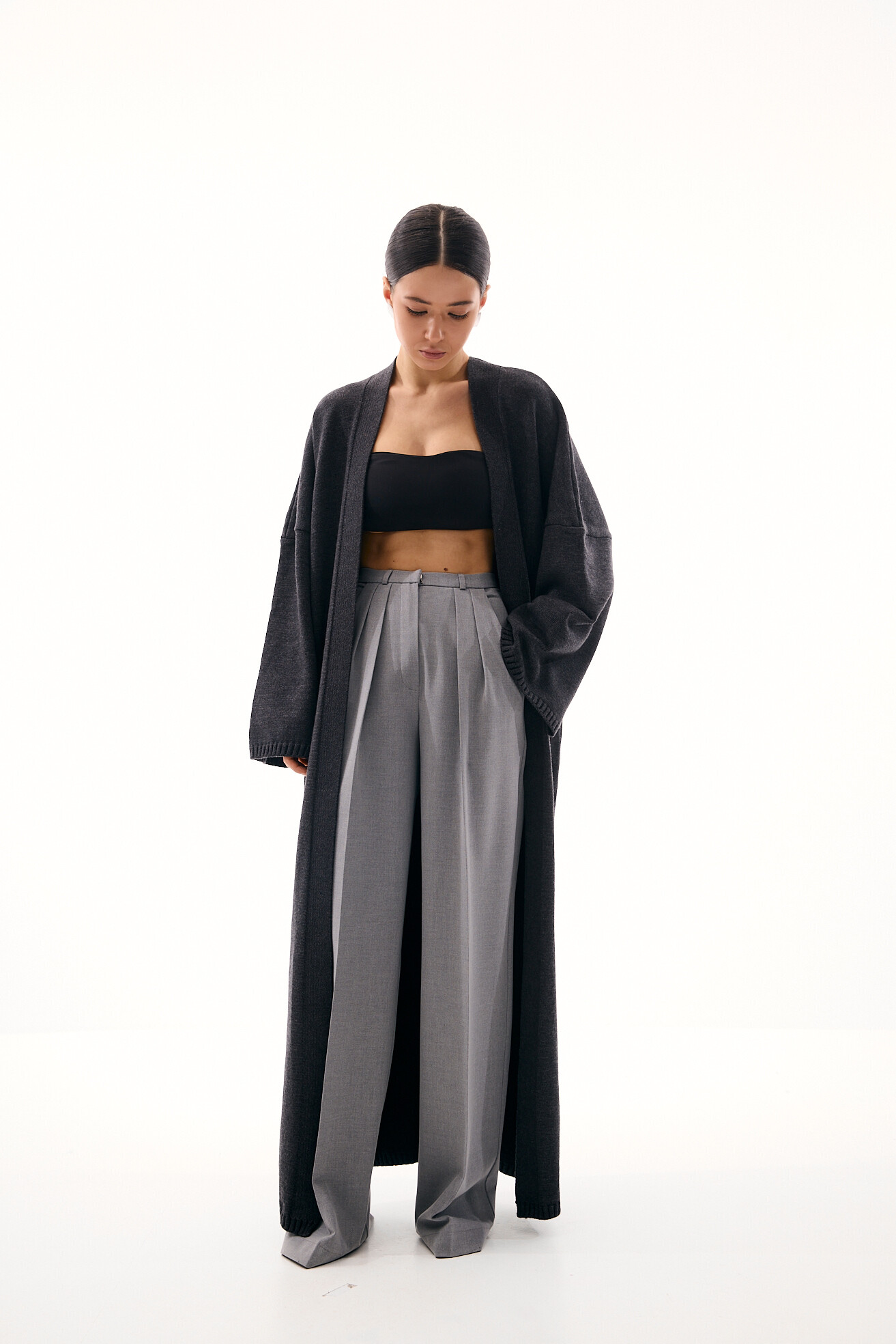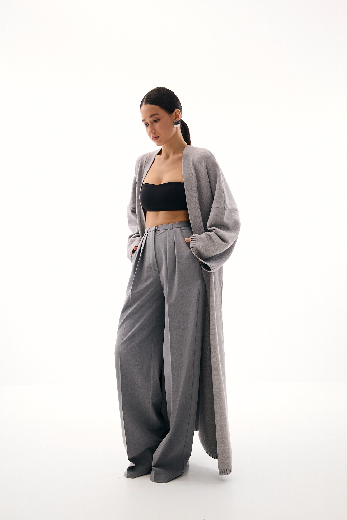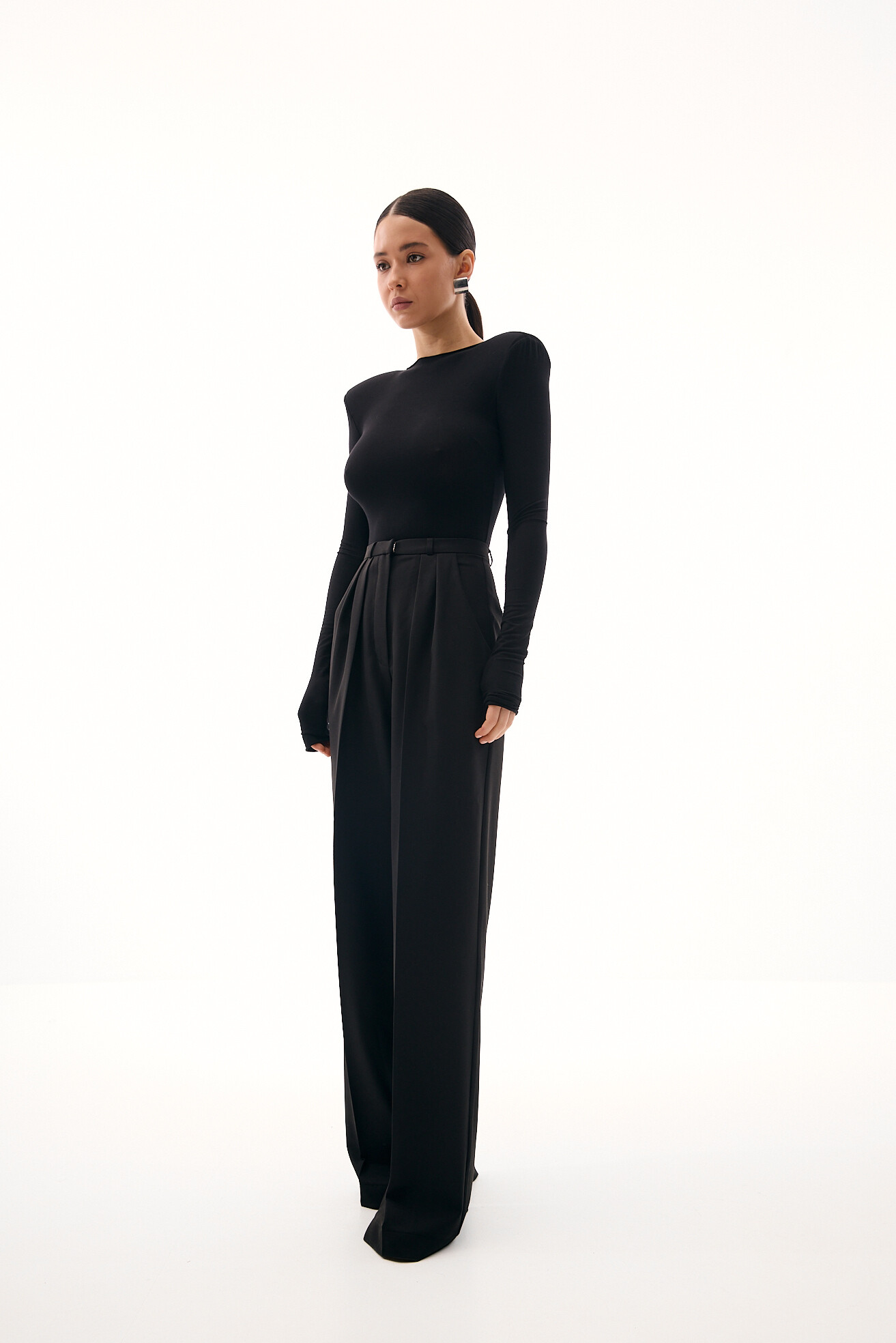 Класична модель широких палаццо, яку ми видозмінили та додали вузький пояс, що робить силует більш акуратним та елегантним. Такий прийом красиво коригує фігуру, візуально зменшуючи об’єм у талії то роблячи її акуратнішою. Модель виглядає свіжо й актуально, зберігаючи при цьому універсальність. Виконані з щільної костюмної тканини, ці штани ідеально підходять для створення базових стильних образів.