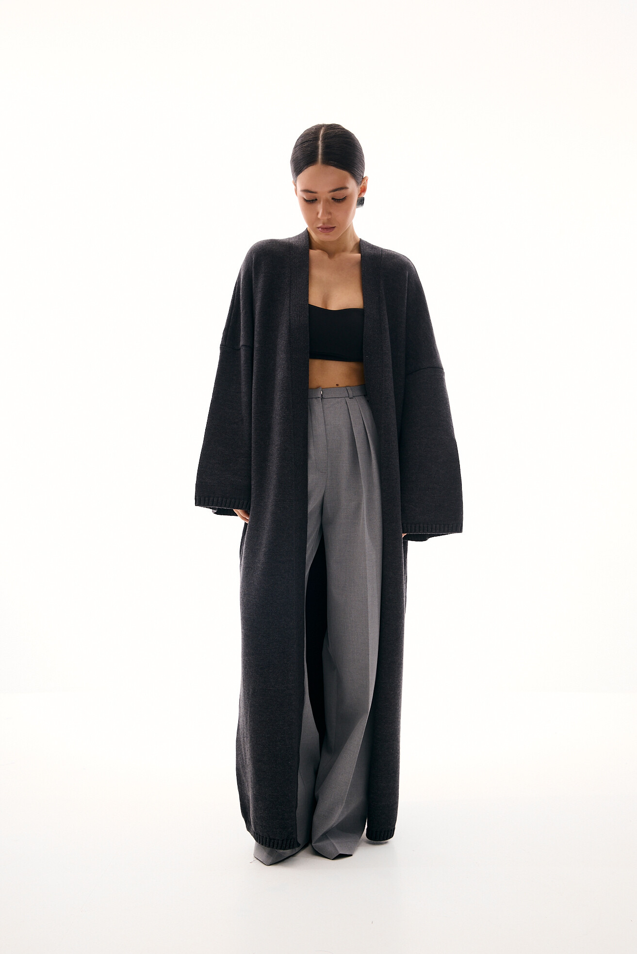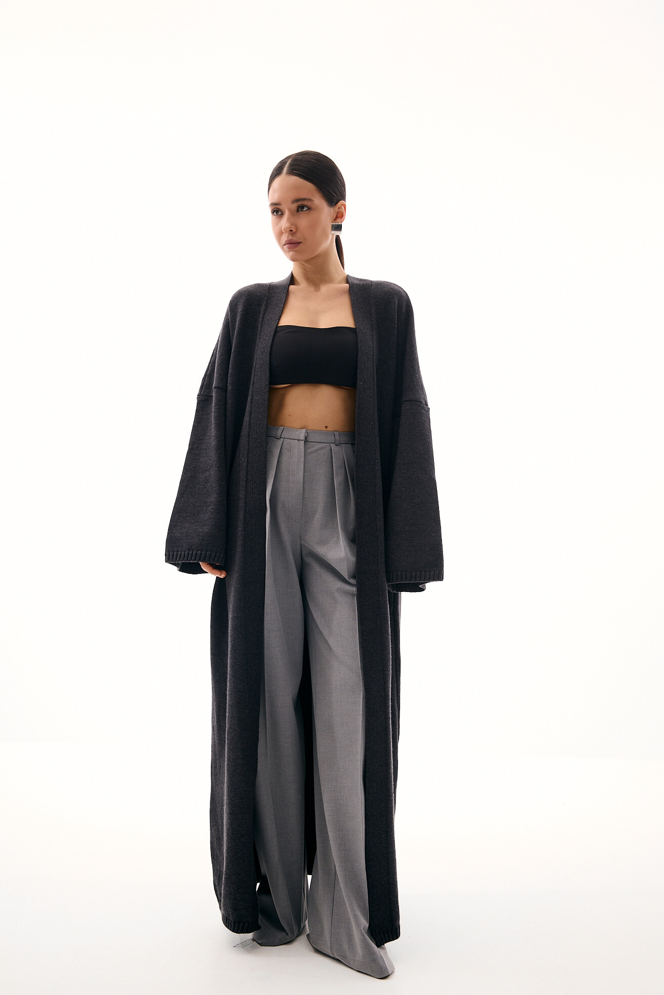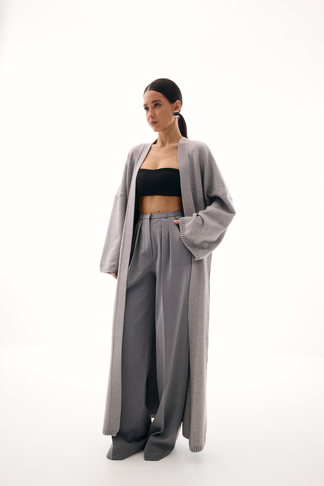 Класична модель широких палаццо, яку ми видозмінили та додали вузький пояс, що робить силует більш акуратним та елегантним. Такий прийом красиво коригує фігуру, візуально зменшуючи об’єм у талії то роблячи її акуратнішою. Модель виглядає свіжо й актуально, зберігаючи при цьому універсальність. Виконані з щільної костюмної тканини, ці штани ідеально підходять для створення базових стильних образів.